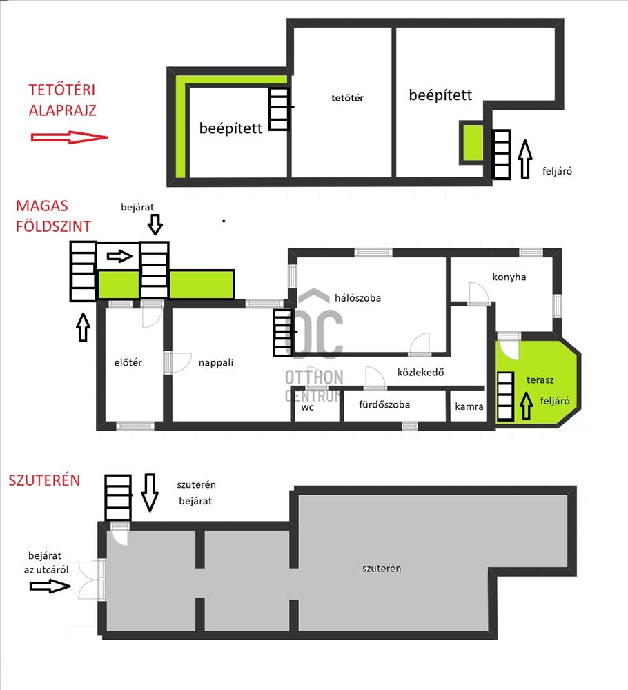 Az ingatlan 3 szintes. a szuterén bejárata utcaszintről, itt igény szerint garázs vagy üzlethelység, raktárral kialakítható. Jelenleg tárolóként működik.