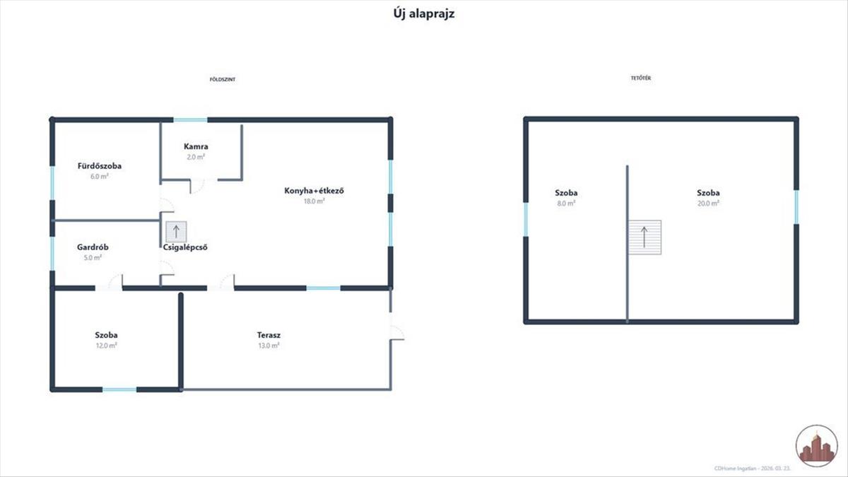 - Emelet(csigalépcső): szoba(20m2), szoba(8m2)