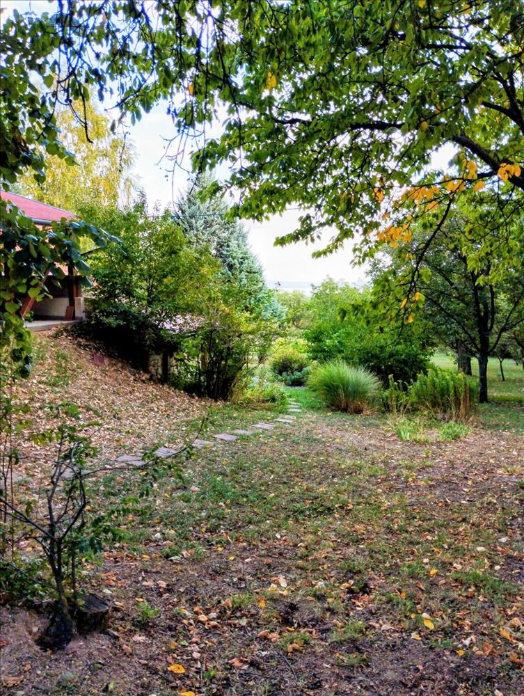 Téglalap alakú, hangulatos, bekerítettlen, enyhén lejtős 3298 m2-es telek tartozik hozzá, melyet gyümölcsfák (6 cseresznyefa, meggyfa, fügefa), csemege szőlő, valamint mandula, nyírfa, feketefenyő, illetve boróka tesz még színesebbé, kellemes intimitást biztosítva minden oldalról a ház tulajdonosának.