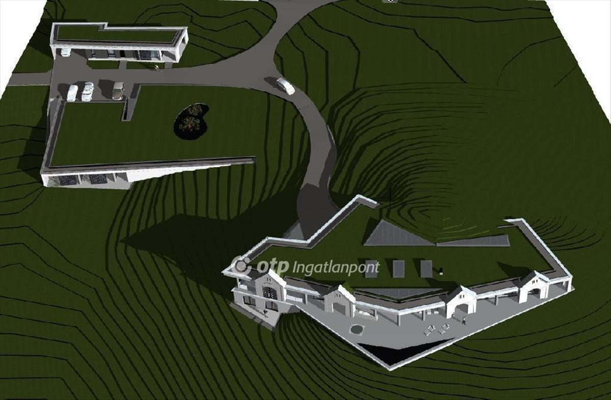 A telek közepén hegybenyúló boros pince épül, panorámás észak felől szélvédett terasszal.