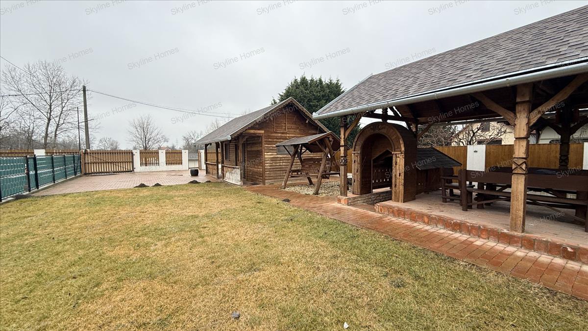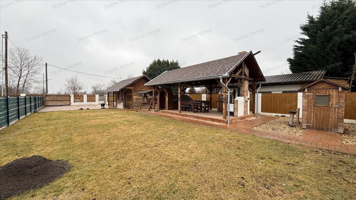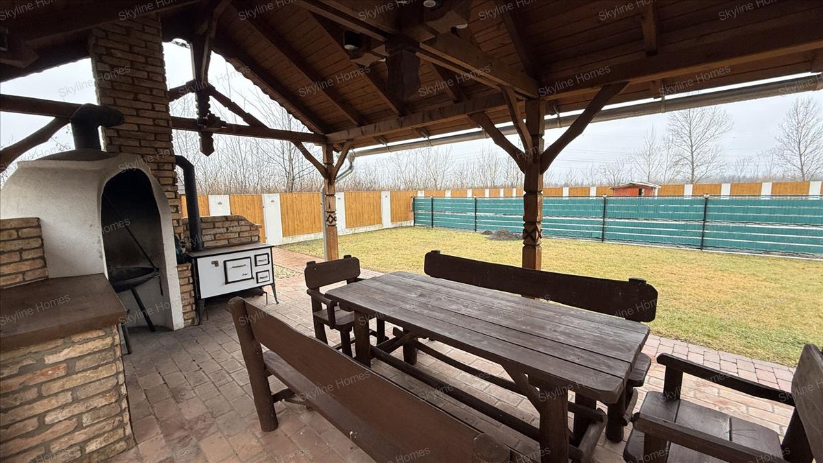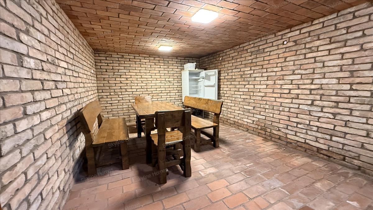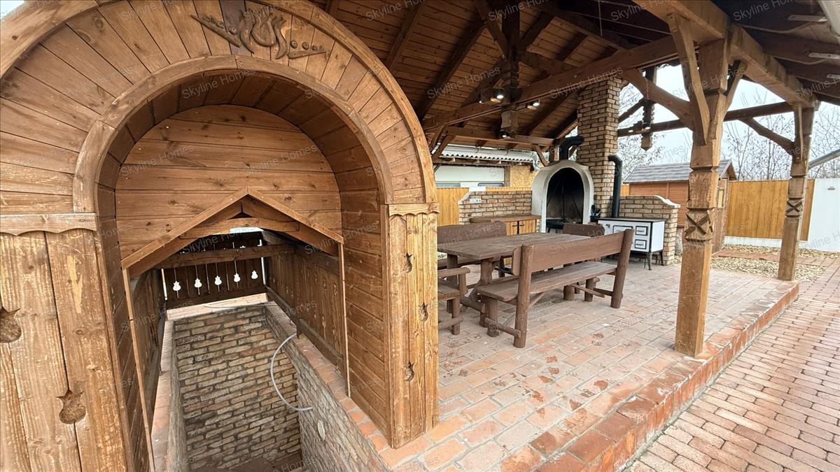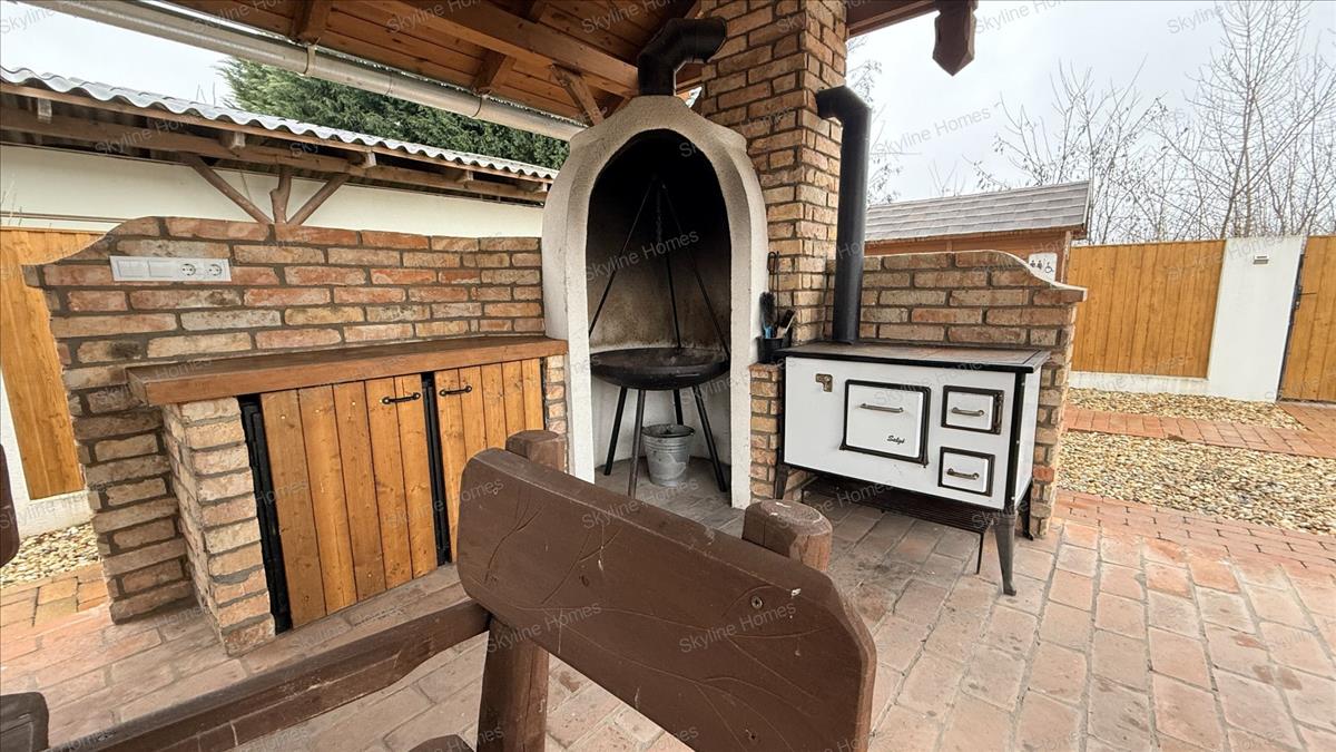 Ha ez még nem lenne elég, a kert hátsó végében található egy nagy méretű fedett szaletli sütő és föző berendezésekkel, a társasági főzések középpontjaképpen. a terasz alatt pedig kiépítésre került egy teljesen alápincézett rész, ahova főleg nyáron érdemes a hűvös miatt ellátogatni.