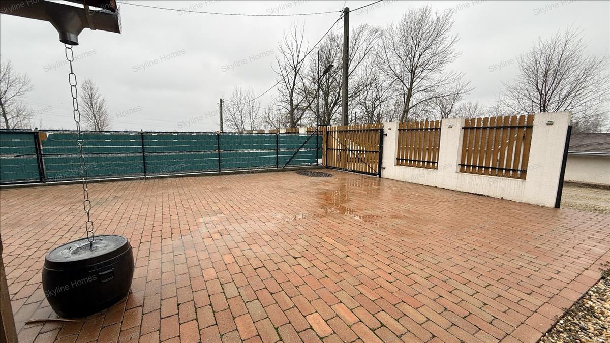 A másik oldalon közvetlen mellette pedig az 500 m2-es telekre érünk, ahol található egy téliesített, minőségi burkolatokkal kialakított könnyeszerkezetes ház.