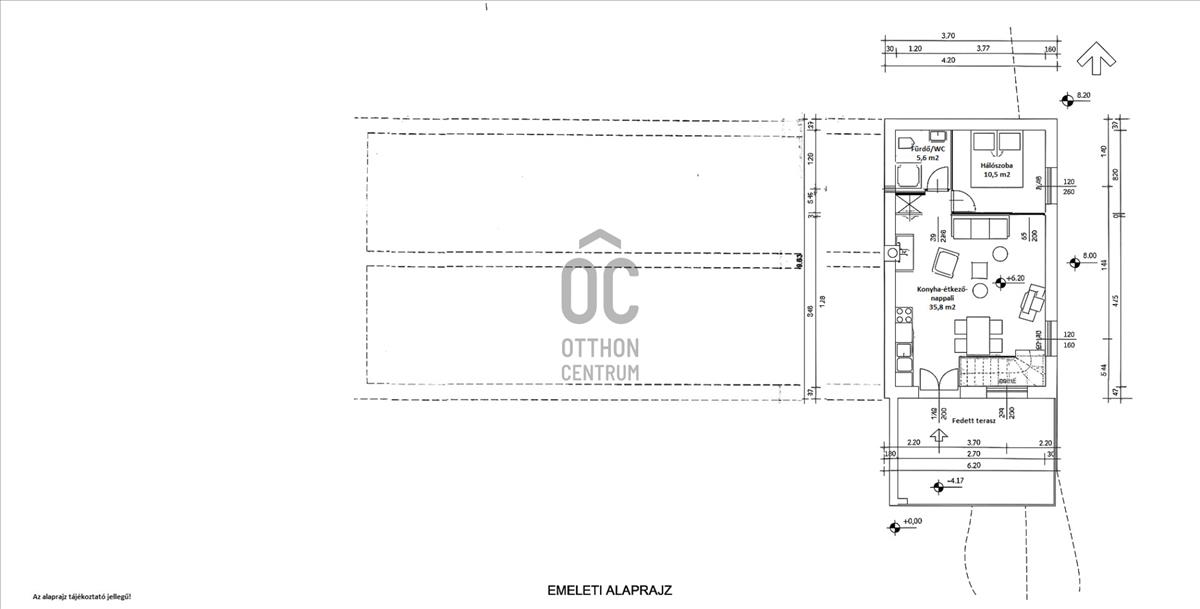 A felső szinten egy 52 m2-es lakrész került kialakításra: nappali-konyha-étkezővel, hálószoba, fürdőszoba/WC, illetve egy nagy terasszal.