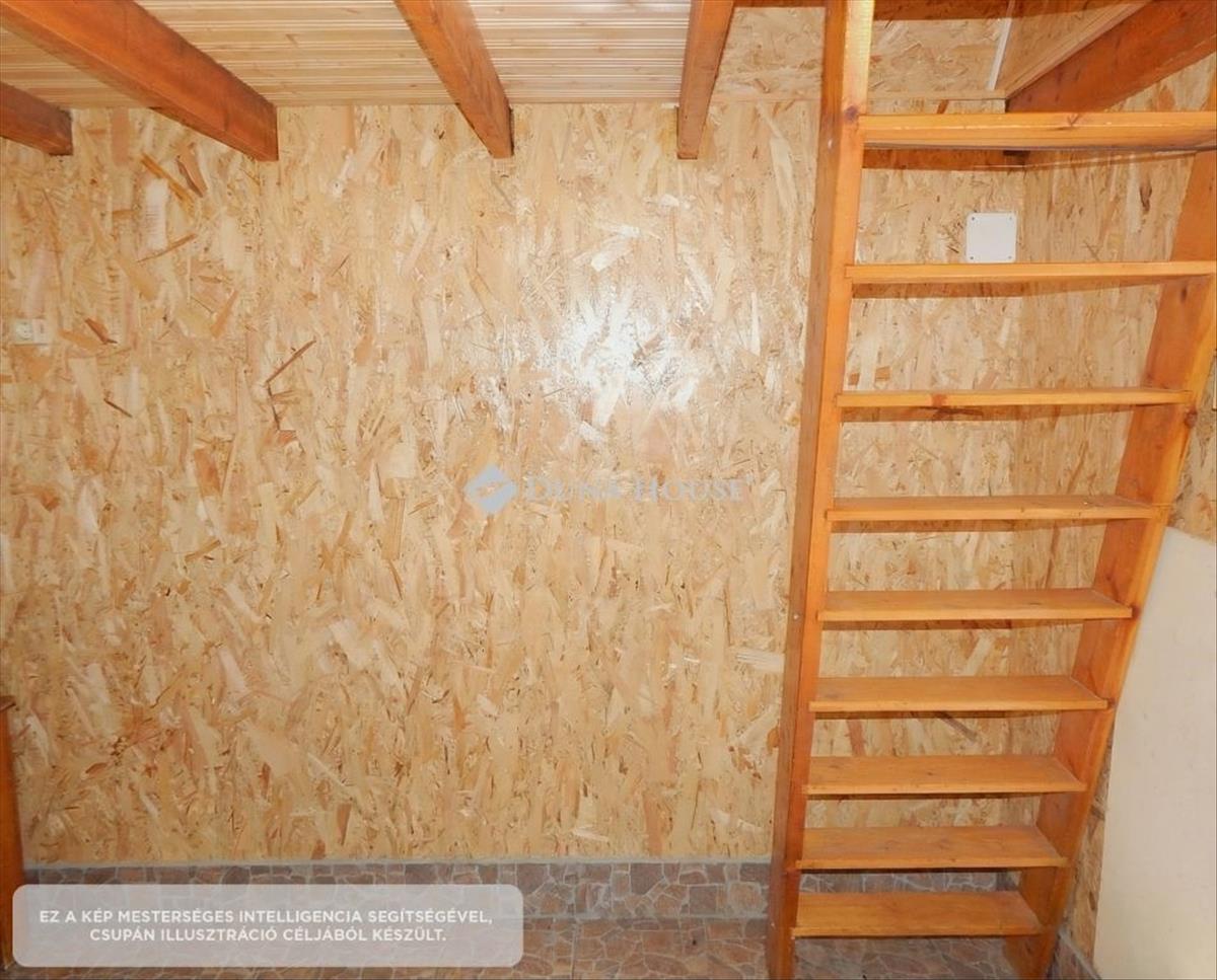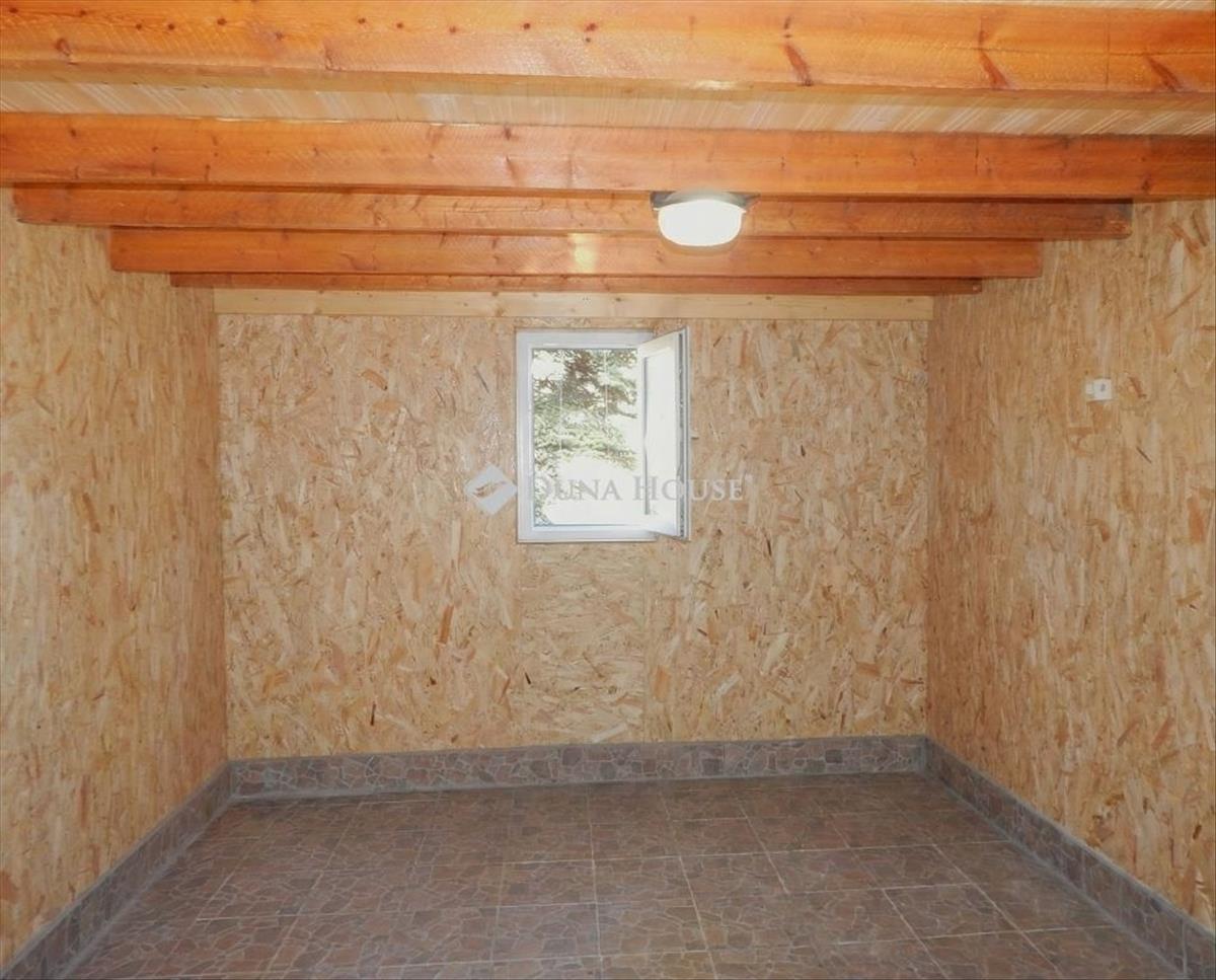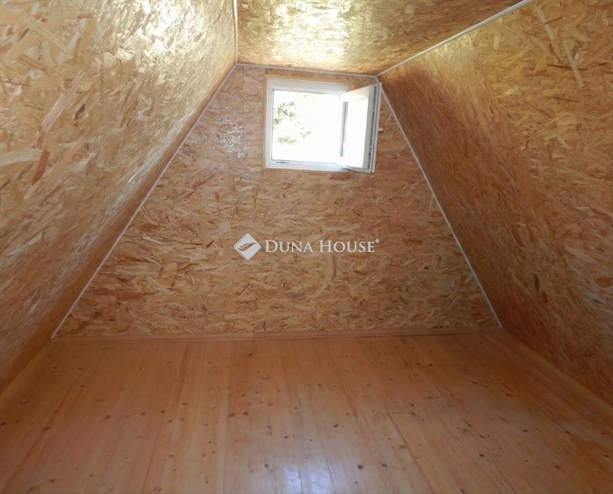 A tetőtér beépítéses házacska nettó 2x11 m², amelyhez 6, 5 m² fedett terasz kapcsolódik. Az épületbe nincs víz bevezetve, a wc külön kis épületben található, amely fa szerkezetű, és másik oldala egy fás fészernek is helyet ad.