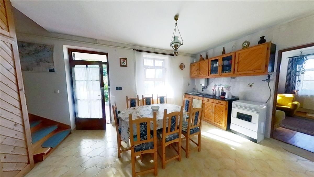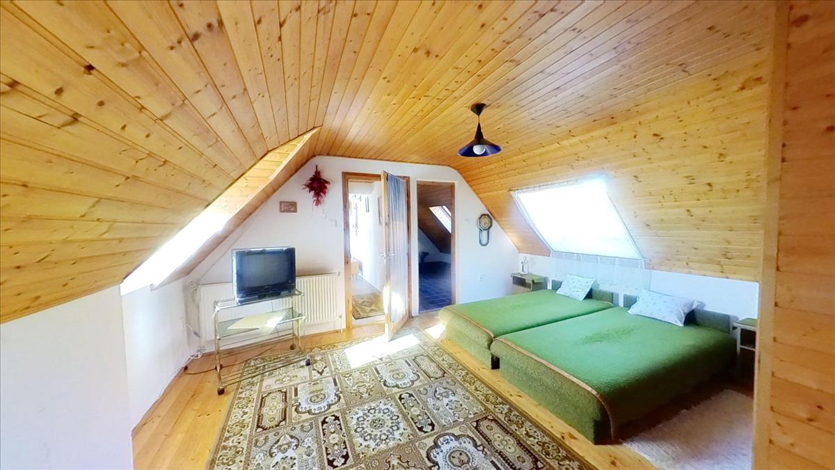 A két épületből álló ingatlan egyik épülete tetőteres, önálló családiházként, vagy nyaralóként egyaránt működhet. a másik épület 5 szobás apartman ház, szintén tetőtér beépítéses. a házak déli fekvésüknek köszönhetően szinte napkeltétől napnyugtáig benapozottak. Mindkét épület fűtéséről gázkazán gondoskodik radiátorokkal.A kisebb, egy lakóegységes 100 m2–es épület fűtését kiegészíti a földszinten és a tetőtérben elhelyezett cserépkályha, melyek önállóan is képesek a ház kifűtésére. Ebben az épületben a földszinten egy rendkívül tágas, világos nappali-étkezőt találunk, mely egy légtérben van a konyhával is, valamint egy mosókonyhát WC-vel. a tetőtérben két hálószoba és egy fürdőszoba lett kialakítva. a földszinten a nappaliból kilépve egy nagyméretű fedett terasz áll rendelkezésre a kinti kikapcsolódáshoz.
