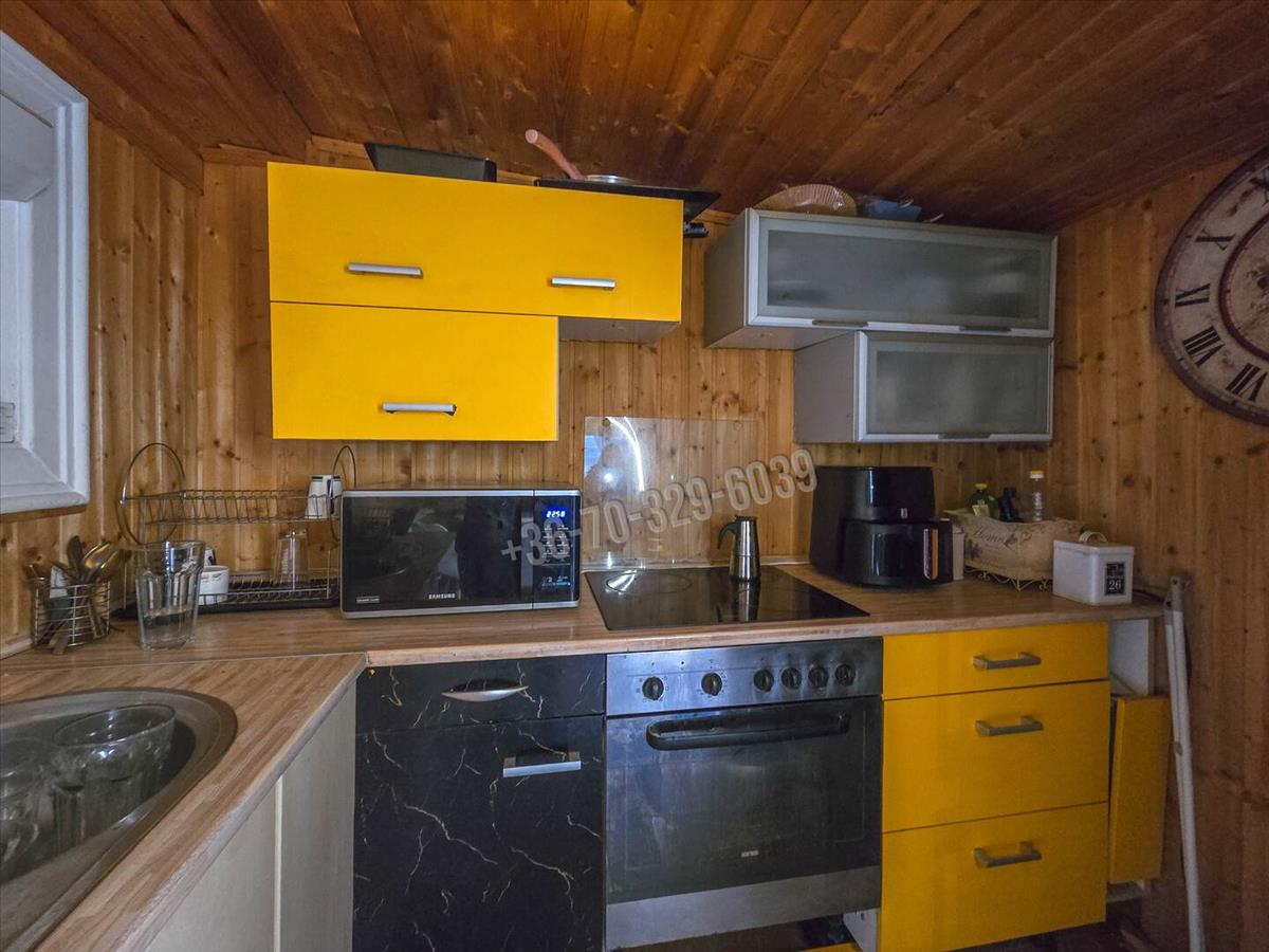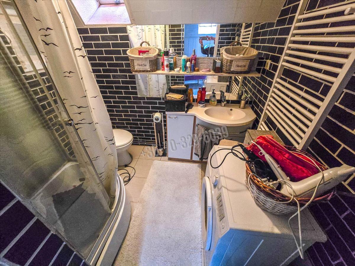 Elosztása: kis előtér, konyha, nappali, fürdő, emeleten 2 kisebb méretű szoba.
