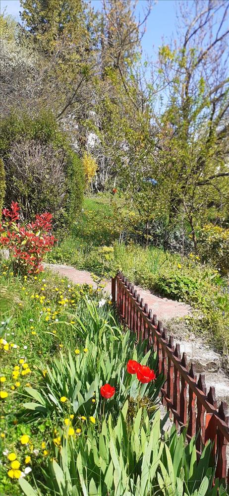 -Teraszos, több részes kert sokféle gyümölcsfával.