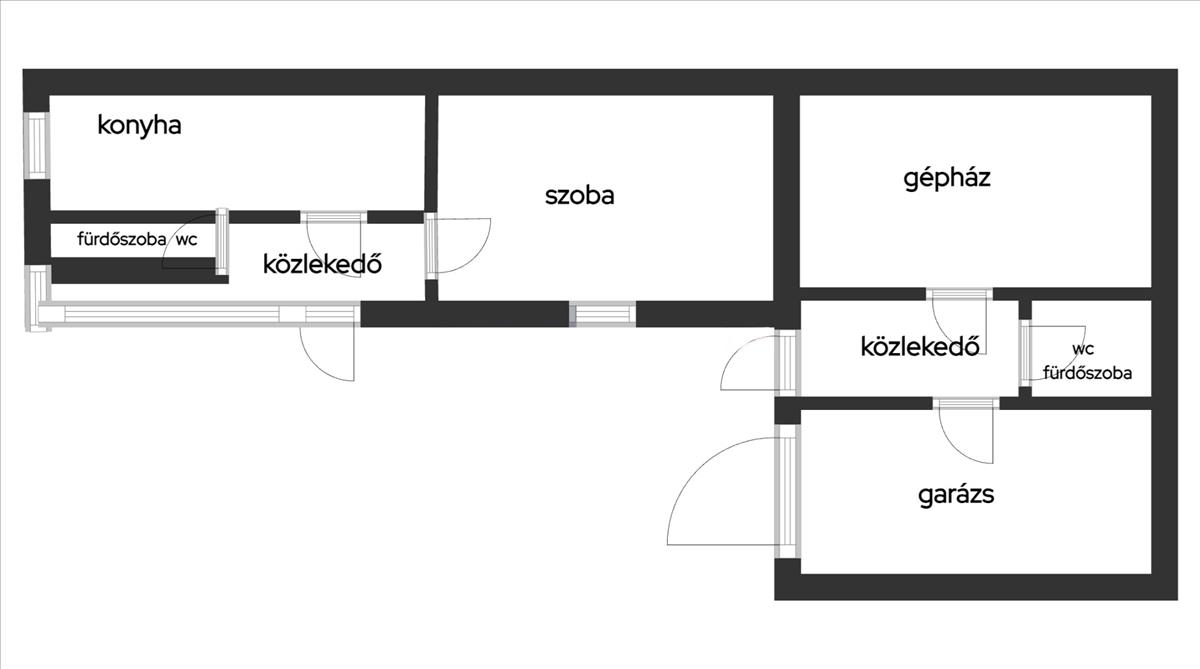 Helyiségei: Alsó szinten konyha, közlekedő, szoba, fürdő+WC, kazánház, plusz egy külön fürdő+WC, garázs. Összesen 70 négyzetméter.