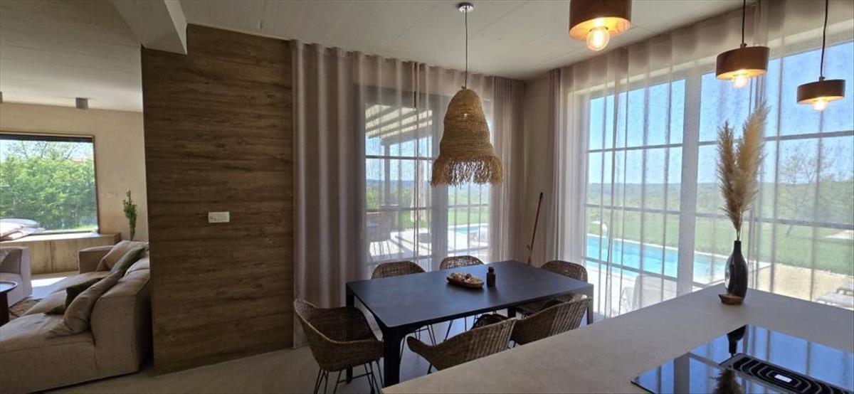Nem messze Motovuntól eladó ez az egyedülálló, modern kialakítású villa. Az építési övezet szélén, egy dombtetőn elsöprő kilátást nyújt a környező dombokra, a természetre és a zöldellő tájakra. a kilátás az egyik oldalon a távolban a tengerre, a másik oldalon Motovunra nyúlik.