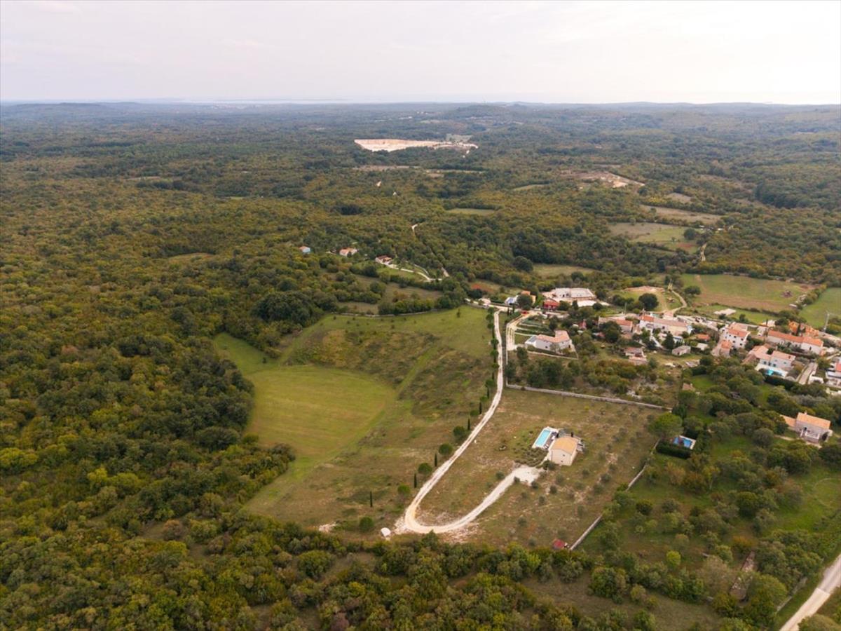 Egyedülálló ingatlan lehetőség Kanfanarban, Rovinj közelében, körülbelül 12 km-re a tengertől, egy tágas, 34, 315 m²-es birtokot kínál, házzal és fűtött sós vízű medencével.A birtok körülbelül 8, 500 m²-t tartalmaz az építési zónában, és jelenleg egy lakóházat kínál, amelynek bruttó alapterülete 171 m², valamint egy 39 m²-es kültéri medencét. Lehetőség van két további ház építésére medencével, így ez vonzó befektetés Istria számára a turizmus, a bérleti jövedelem és a családi élet szempontjából, közel Rovinjhoz és az Adriai-tengerhez.