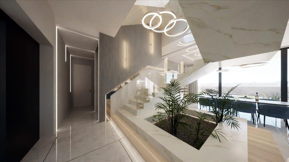 A földszint a kifinomultság és a funkcionalitás bemutatója, barátságos bejárattal, wellness-részleggel, játékteremmel, stílusos konyhával, valamint egyterű étkezővel és nappalival. a nappaliból és a konditeremből ki lehet lépni a fedett teraszra, ahol egy gyönyörű medence és egy hangulatos társalgó várja a kikapcsolódást és a mediterrán esték melegének szívását.