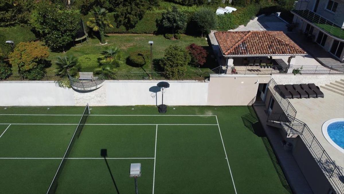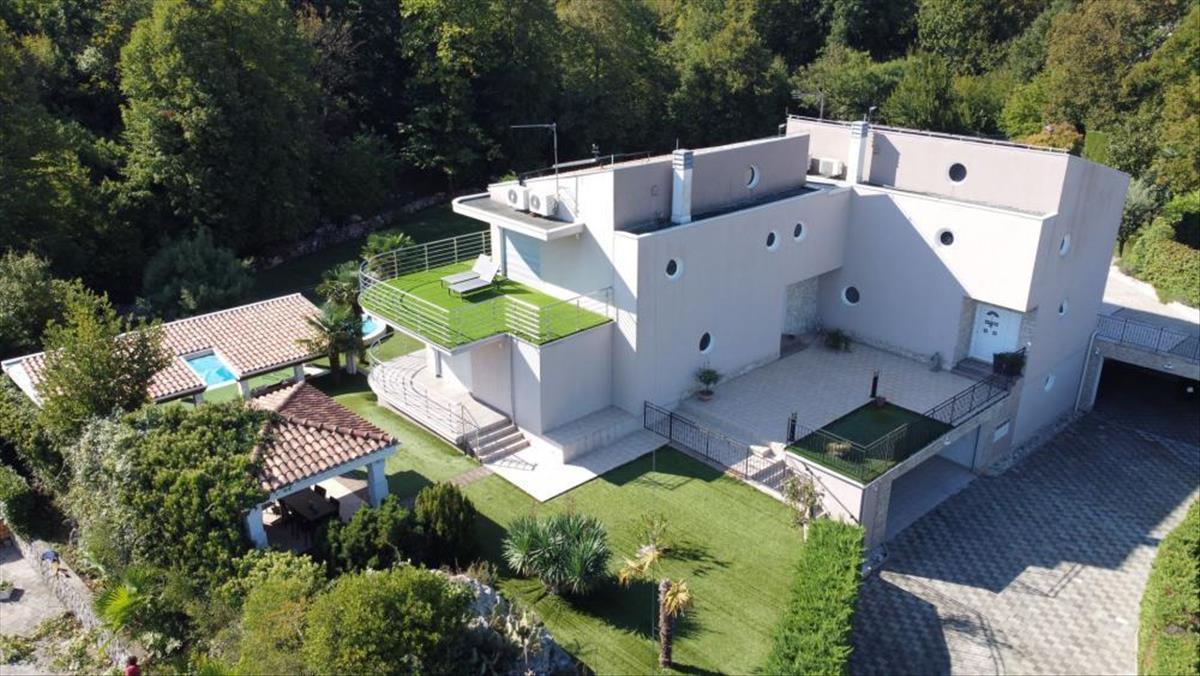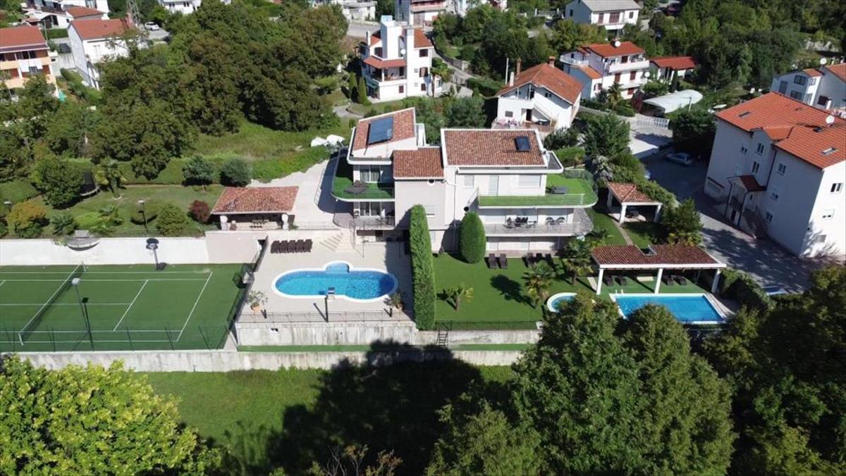 Ez a gyönyörű lakótér a következő elrendezésű: földszint: 105 m2-es garázs, fedett átjáró, lakás, mosókonyha, taverna WC-vel, jacuzzi, szauna, kazánház és tároló - összterület 287, 13 m2. Első emelet: nyitott terű nappali, étkező, konyha, nagy dolgozószoba és wc (területe 80, 68 m2), belső lépcsőház, fedett terasz, fedett terasz 93, 20 m2 - bruttó terület 372, 78 m2 második emelet: 3 hálószoba, amelyek közül az egyik saját öltözővel és fürdőszobával rendelkezik, a másik kettőből pedig terasz nyílik és mindegyik 92, 44 m2-en a ház kertjében medence és burkolt napozórész, pavilon grillezővel és saját teniszpálya található. a ház zöldövezetben, privát és csendes helyen található, és a szeretett Abbázia mindössze 5 perc alatt elérhető. Ez az ingatlan 1 km-re van a tengertől közvetlenül repülővel, vagy 2, 7 km-re autóval (kb. 7 Perc).