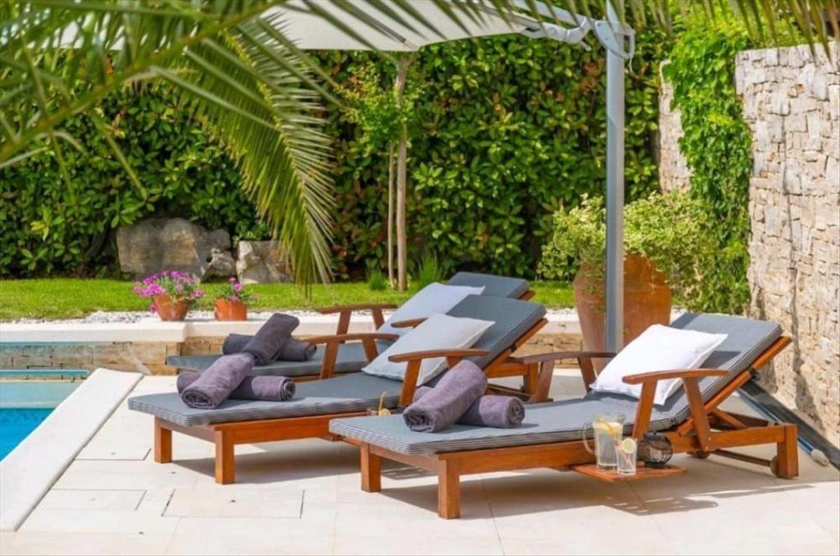 A nappaliból elérhető a kültéri fedett terasz napozórésszel és 50m2-es úszómedencével, valamint kültéri zuhanyzóval.