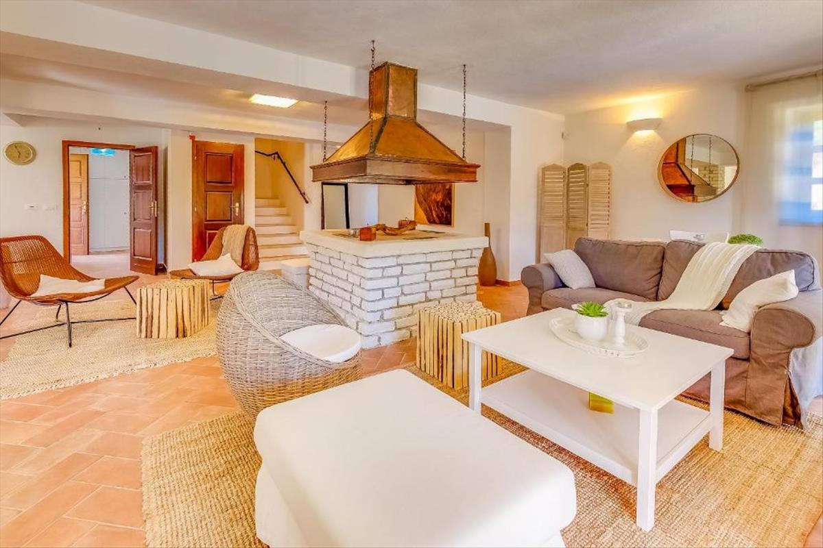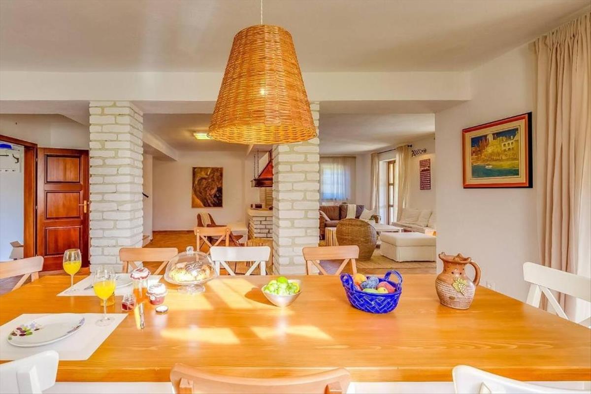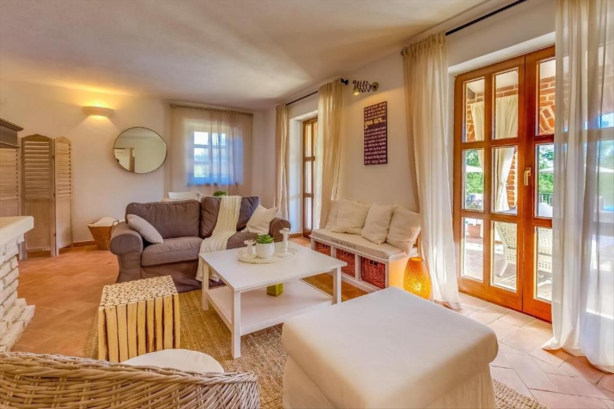 A földszinten a bejárati folyosó egy vendég WC-hez és egy nyitott nappali térhez vezet, amely egy autentikus istriai kandalló köré összpontosul. a nappali zökkenőmentesen kapcsolódik a modern konyhához és étkezőhöz, és a nagy üvegajtók a fedett teraszokra és a buja kertre nyílnak. Ezen a szinten két kényelmes hálószoba is található, mindkettő közvetlen hozzáféréssel rendelkezik a kültéri területhez, lehetővé téve a természetes fény bőséges beáramlását és a környező természettel való erős kapcsolatot.