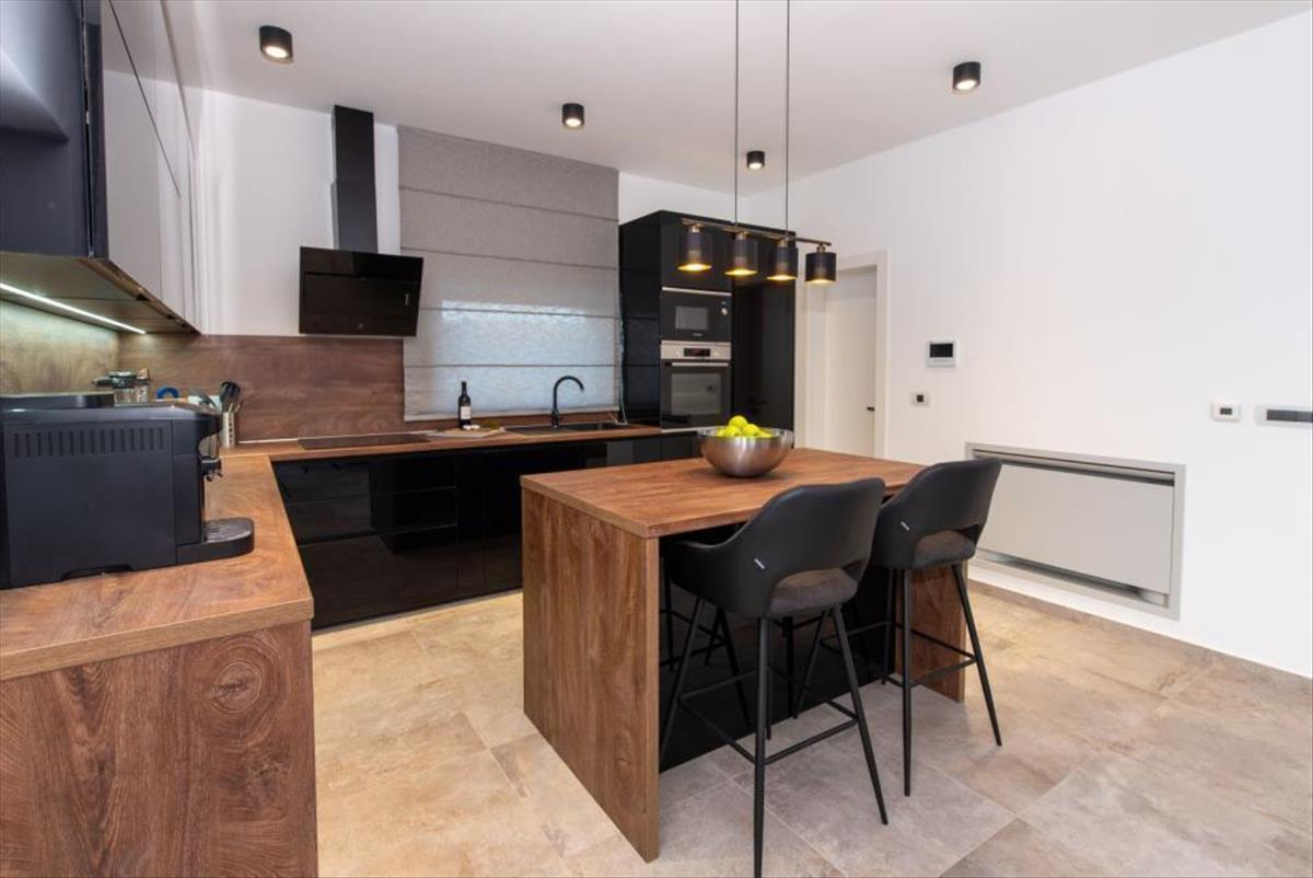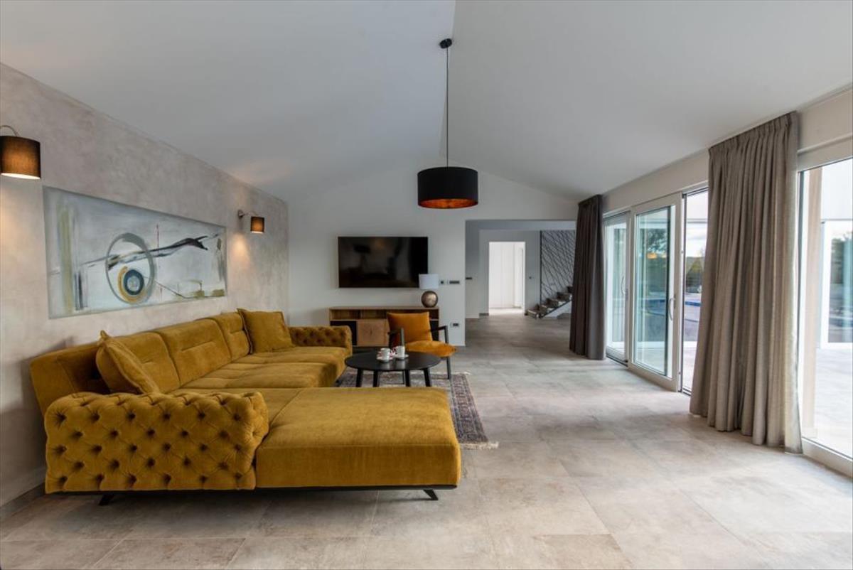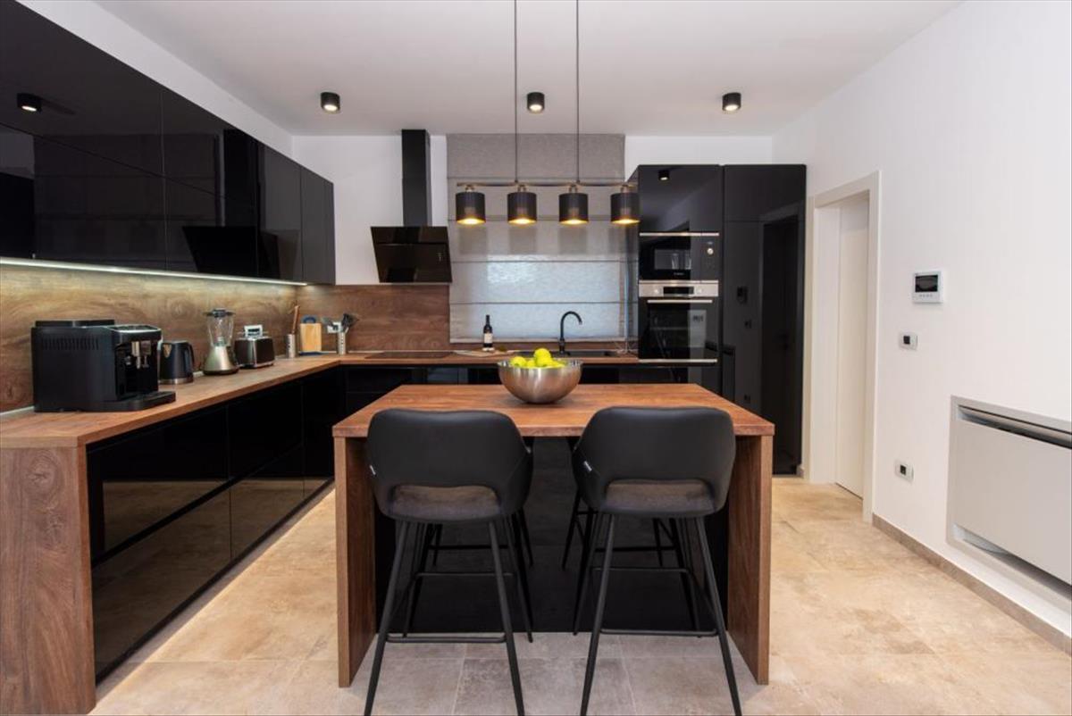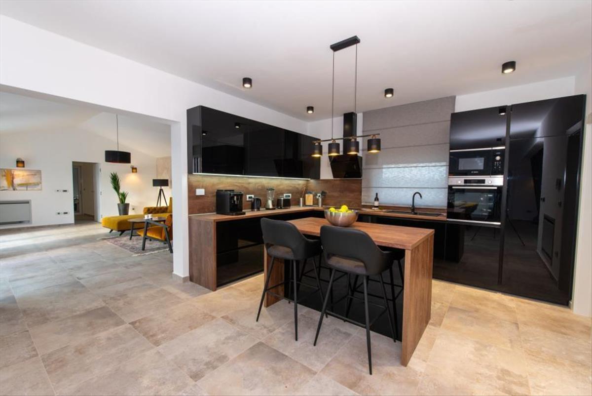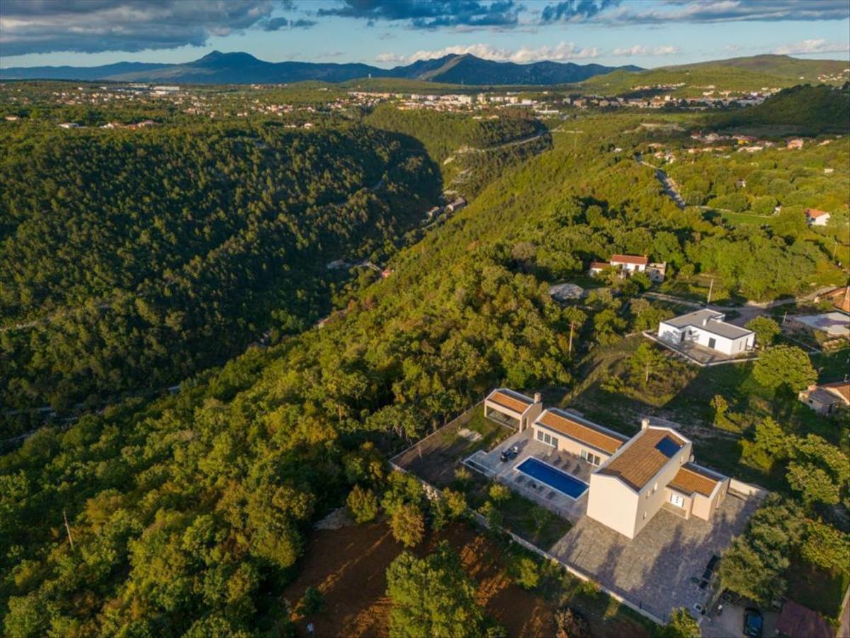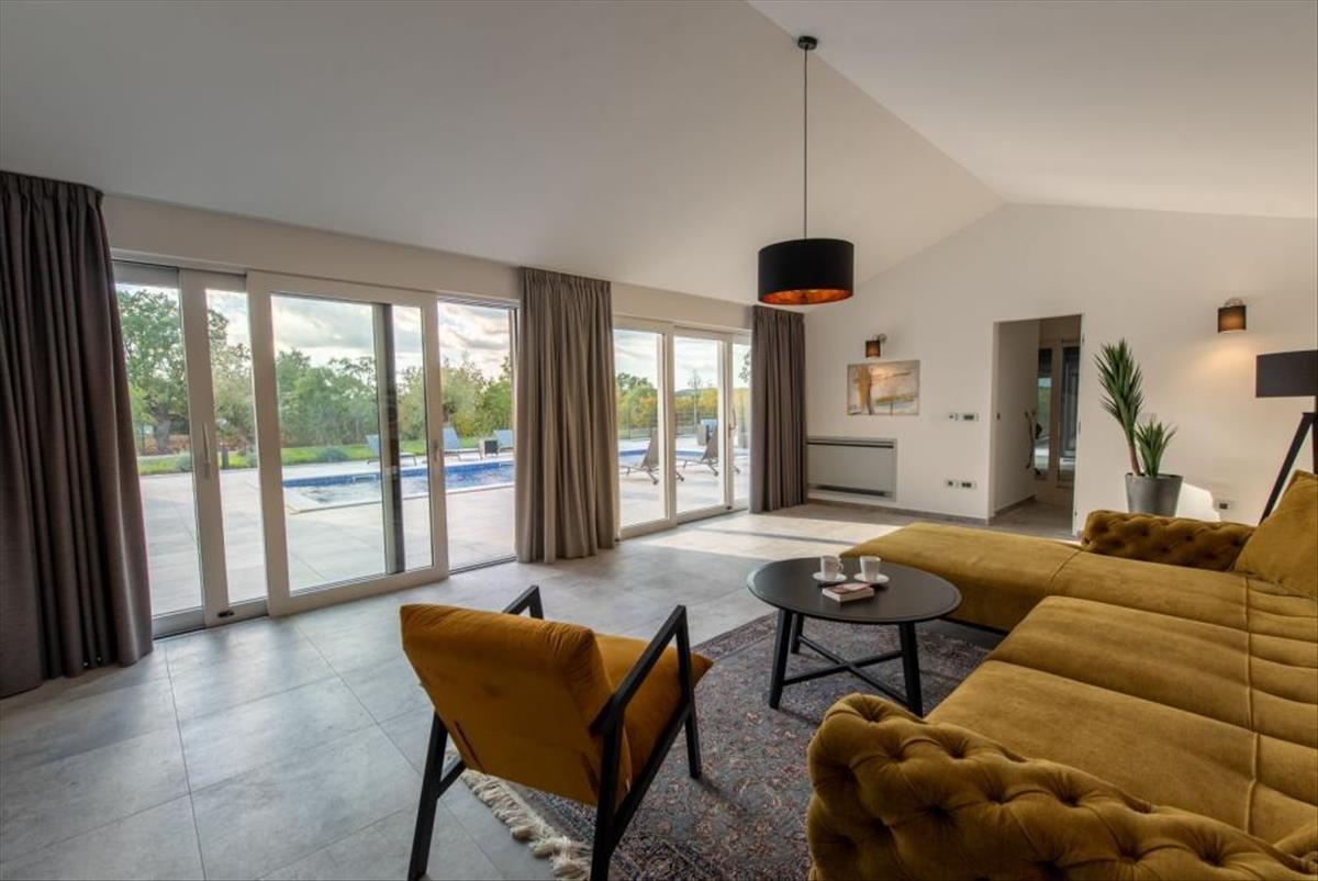A kiterjedt üvegfalak az egész földszintet átfogják, kilátást nyújtva Labin felé, és bőséges napfényben fürdetik a belső teret, harmonikusan ötvözve a környező természettel és növényzettel. Lépcső vezet fel az első emeletre, ahol további három hálószoba található, mindegyik saját fürdőszobával. Az egyik szoba hozzáférést biztosít egy félreeső teraszhoz, amely tökéletes a magánélet és az intimitás biztosítására.