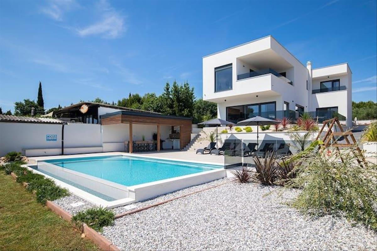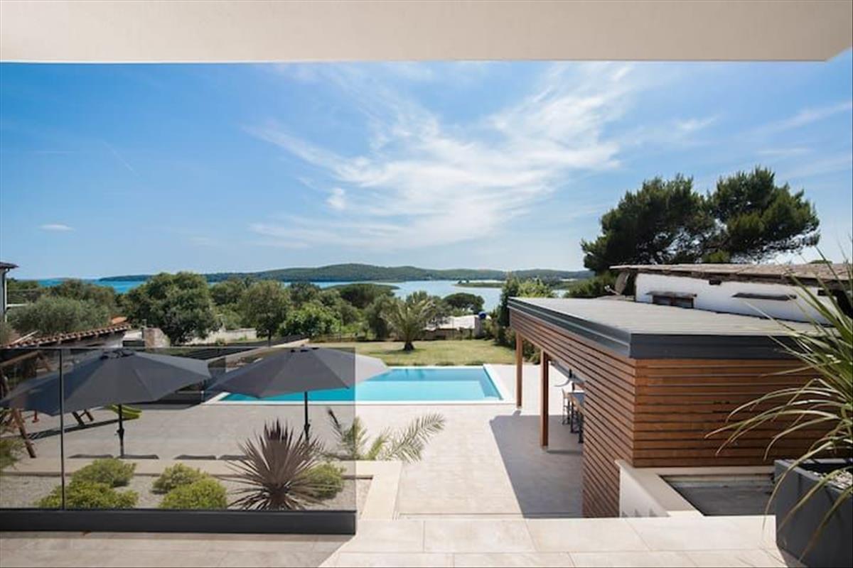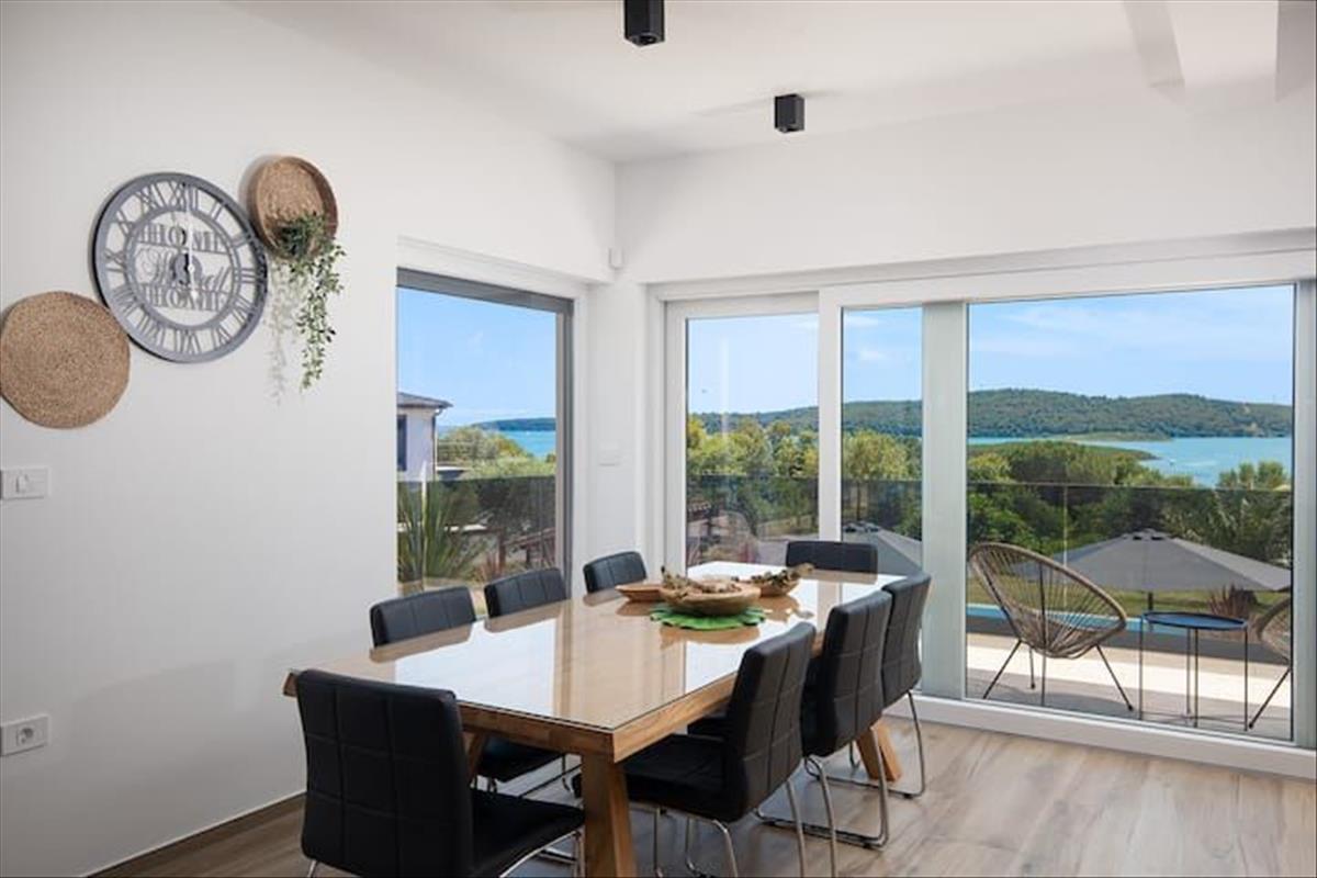Ez a modern villa Pomeren, Medulin közelében, kivételes kombinációját kínálja a luxusnak, a kényelemnek és a lenyűgöző panorámás tengerre néző kilátásnak. Csendes, lakóövezeti területen helyezkedik el, amely békés környezetet biztosít, mindössze néhány percre a strandoktól, tengerparti sétányoktól és alapvető szolgáltatásoktól. Gondosan megtervezett elrendezésével, kiváló minőségű bútorzataival és gondosan kialakított kültéri terével ez az ingatlan ritka lehetőséget kínál arra, hogy birtokba vegyen egy darabot a paradicsomból a déli Isztria partján.A villa összes lakóterülete 195 négyzetméter, két szinten elosztva. a földszinten egy elegáns előszoba található beépített szekrényhellyel és tárolóhelyiséggel. Ez egy tágas, nyitott nappali térbe nyílik, ahol a magas mennyezetek és a tágas üvegfalak zökkenőmentes átmenetet biztosítanak a belső tér és a kültéri környezet között. a nappali nagy és maximális kényelmet biztosít, míg a szomszédos konyha szigettel és családi méretű étkezővel praktikus és stílusos megoldásokat kínál. Az egész tér természetesen kapcsolódik a félig fedett kültéri teraszhoz, amely ideális hely az étkezések élvezetére vagy a lélegzetelállító kilátásban való pihenésre.