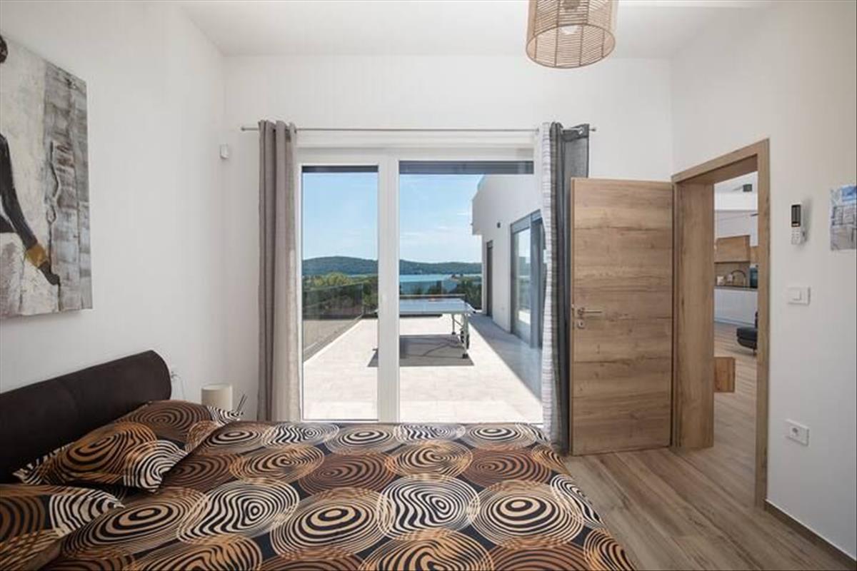 A földszinten található egy vendég wc, egy technikai helyiség és az első a három hálószobából. Ez a hálószoba saját fürdőszobával rendelkezik, és közvetlen hozzáférést biztosít a kerthez és a medence területéhez, valamint egy kis privát teraszhoz – a tökéletes hely, ahol reggeli kávét élvezhet, miközben a tengert és a zöldet csodálja.