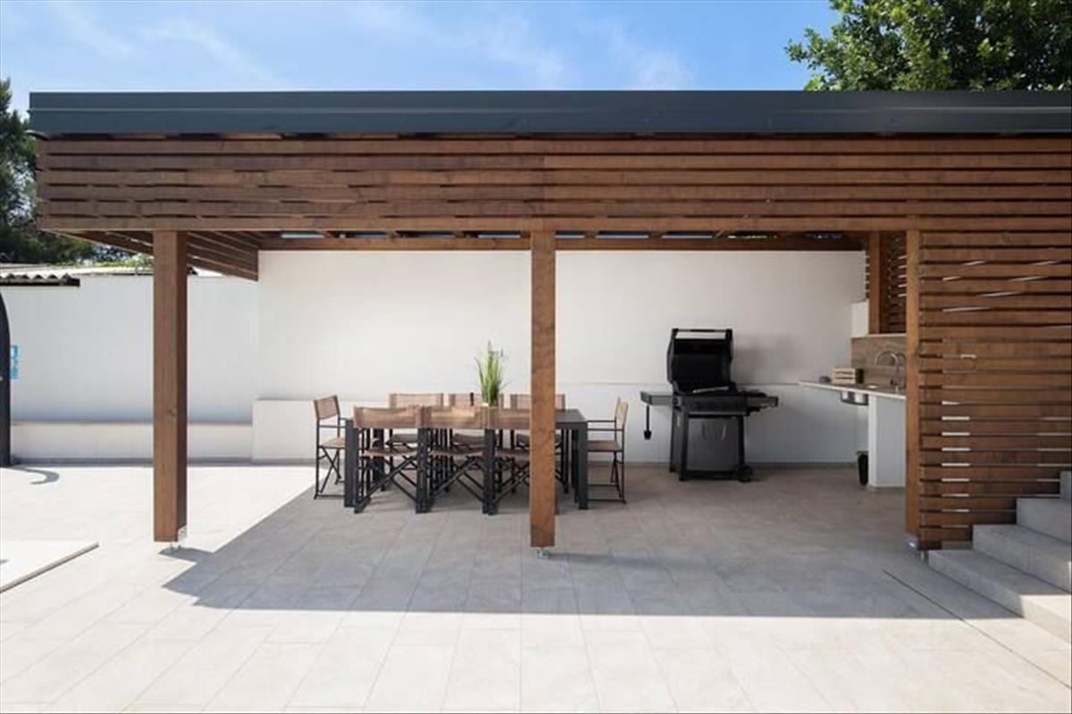 A 991 négyzetméteres telken elhelyezkedő villa egy 766 négyzetméteres, gondozott kerttel rendelkezik, amely teljesen körbekerített a biztonság és a magánélet védelme érdekében. Mediterrán növények és zöld fű teszik a kültéri teret barátságossá és ideálissá családok és háziállatok számára. Egy 45 négyzetméteres árapály medence található a félig fedett terasz alatt, amely előkészítve van egy fűtési rendszer telepítésére. a közelben egy fedett nyári konyha található, amely mindent biztosít a kültéri főzéshez és szórakozáshoz.