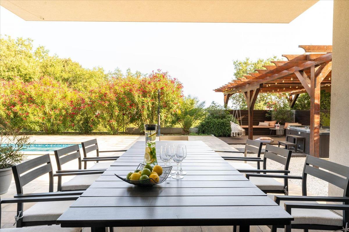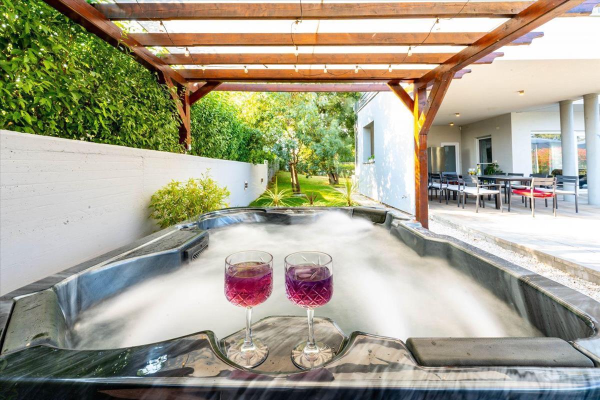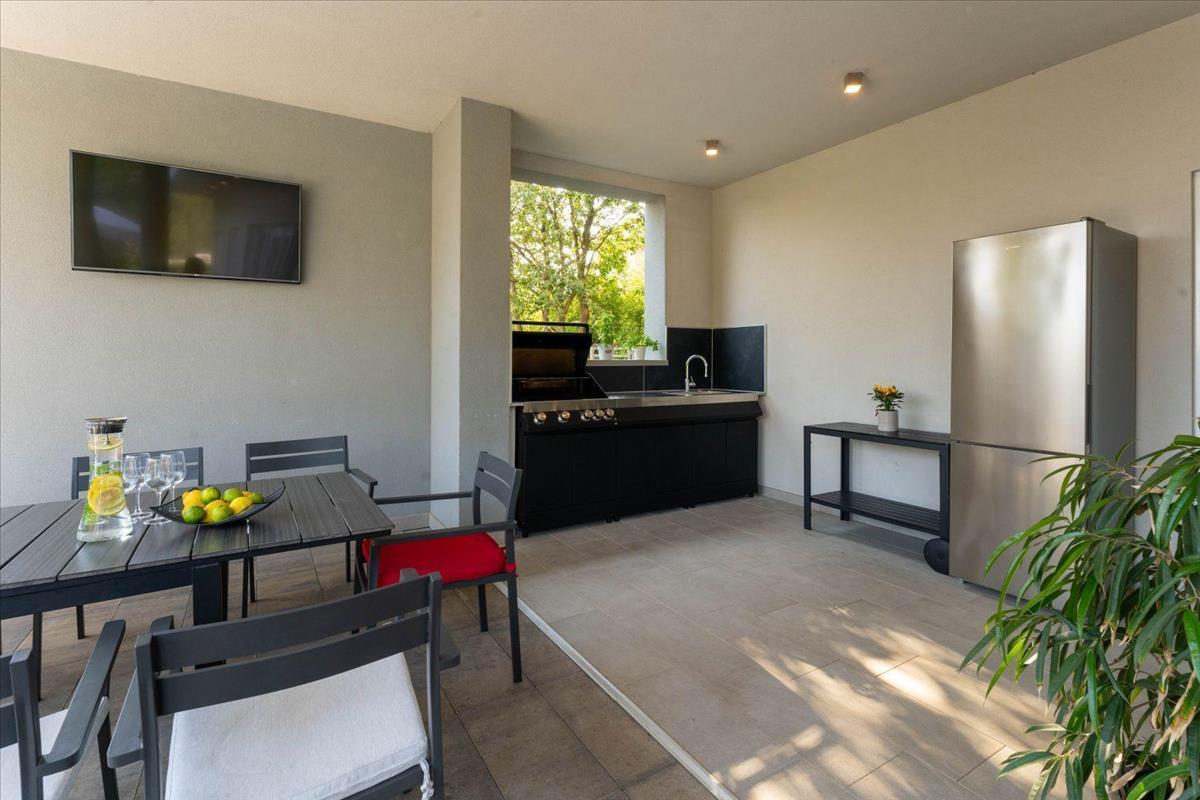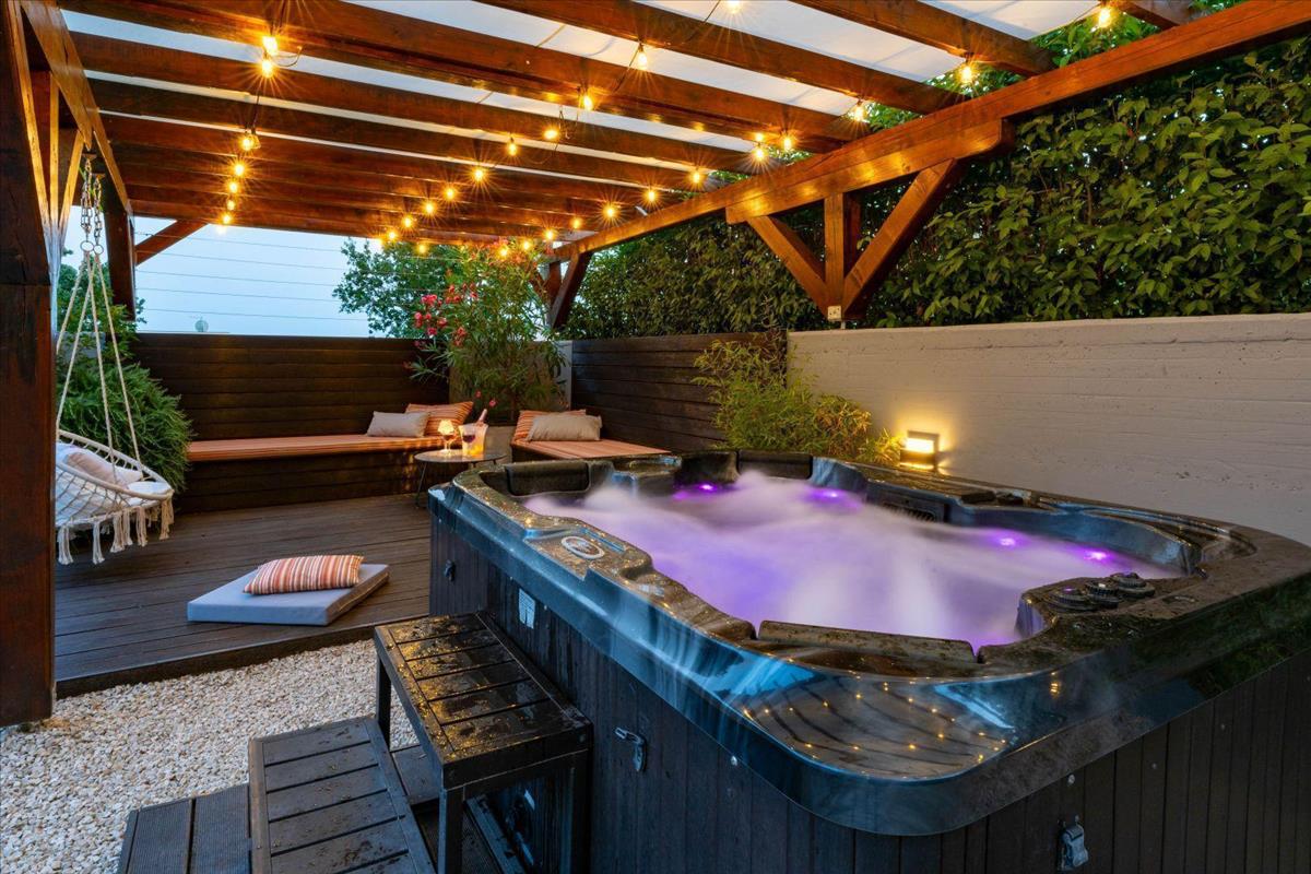 A kertrészben nem csak a medence, hanem egy jacuzzival ellátott társalgó, napozózóna, valamint a nappaliból közvetlenül elérhető, fedett szabadtéri étkezőrész is található gázgrillel.