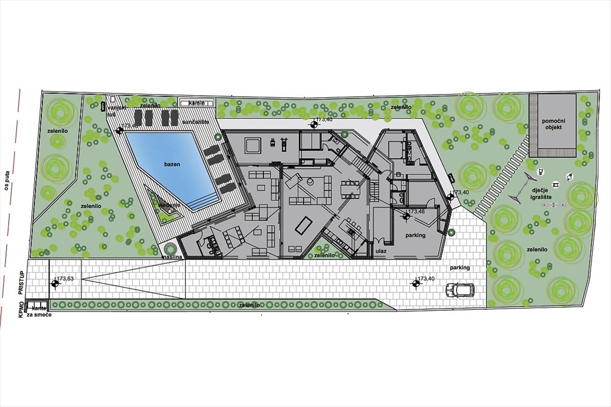 A ház 500 m²-en terül el, két szinten. a földszinten egy nyitott koncepciójú nappali, konyha és étkező található, közvetlen hozzáféréssel egy fedett teraszra, amely ideális a beltéri és kültéri élethez.