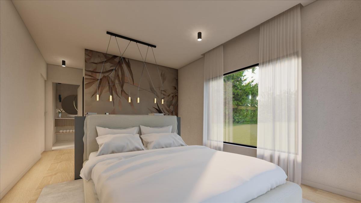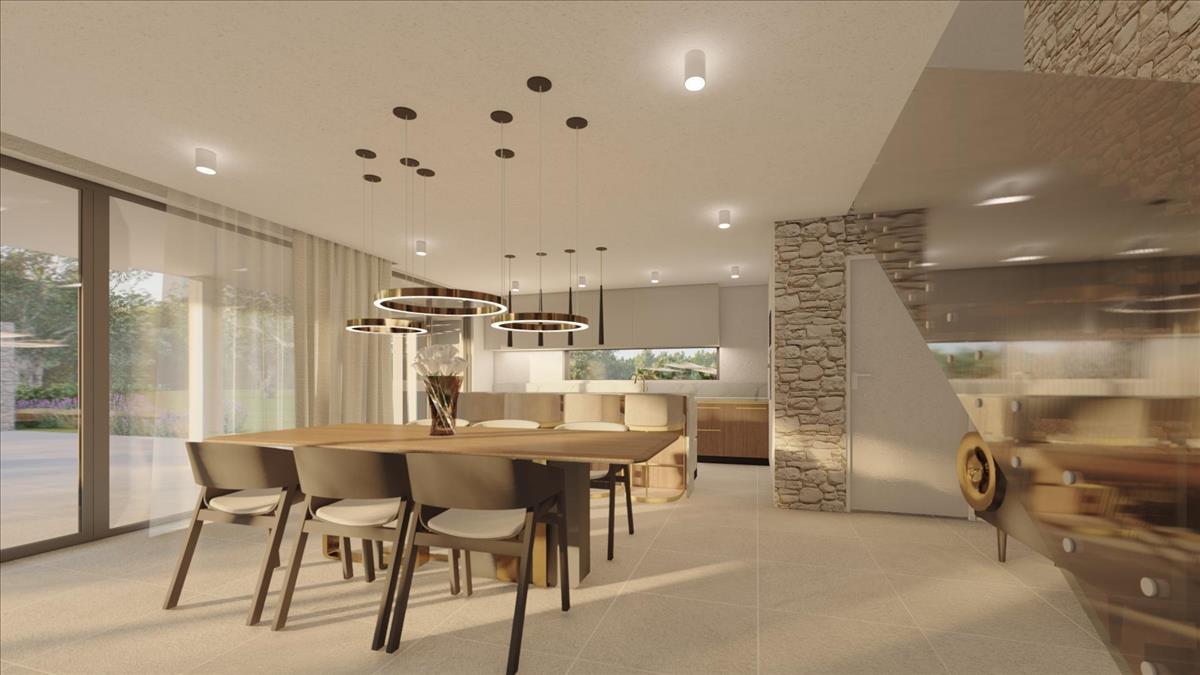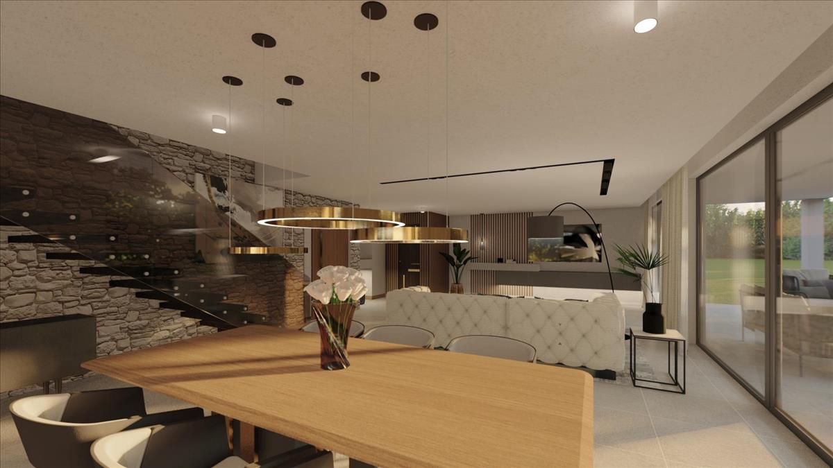 A földszinten egy nyitott koncepciójú nappali, étkező és konyha található, közvetlen hozzáféréssel egy fedett teraszhoz, amely nyári konyhát, vendég WC-t és technikai helyiségeket tartalmaz. Az első emeleten három hálószoba található, mindegyik saját fürdőszobával és hozzáféréssel egy panorámás tengerre néző teraszhoz. a parkosított és kerített kertben egy medence található napozóterülettel, amely tökéletes helyet biztosít a pihenéshez és a szabadtéri szórakozáshoz.