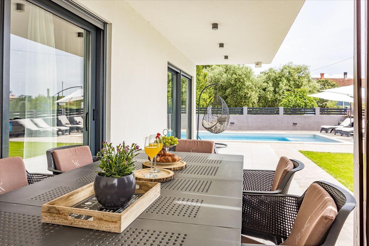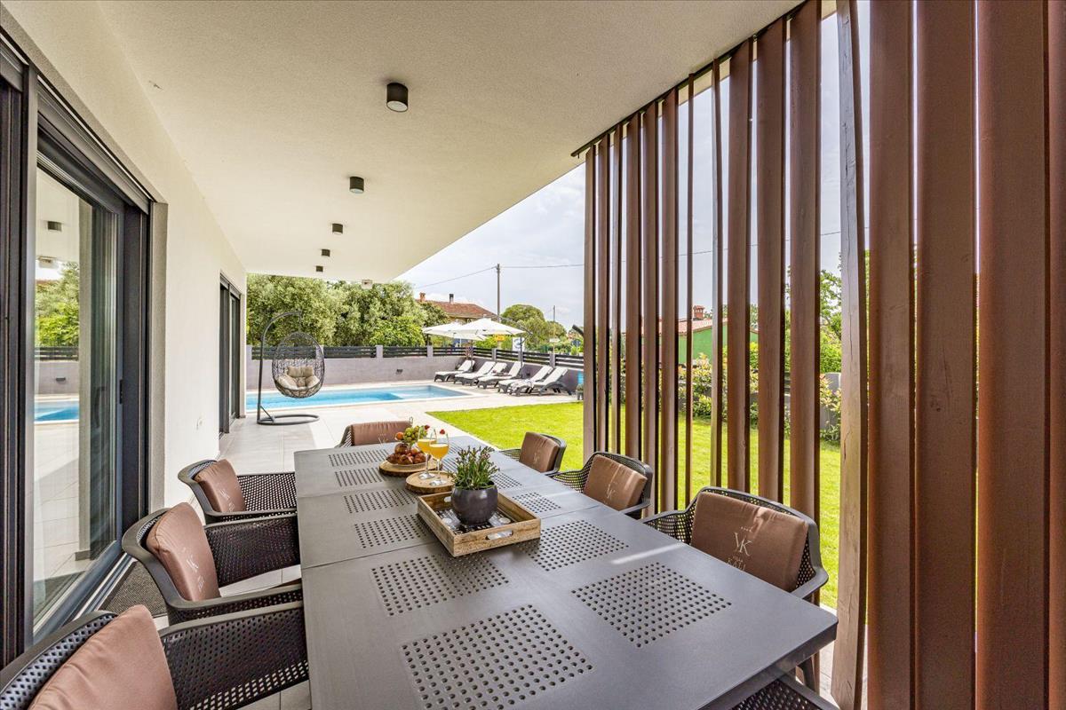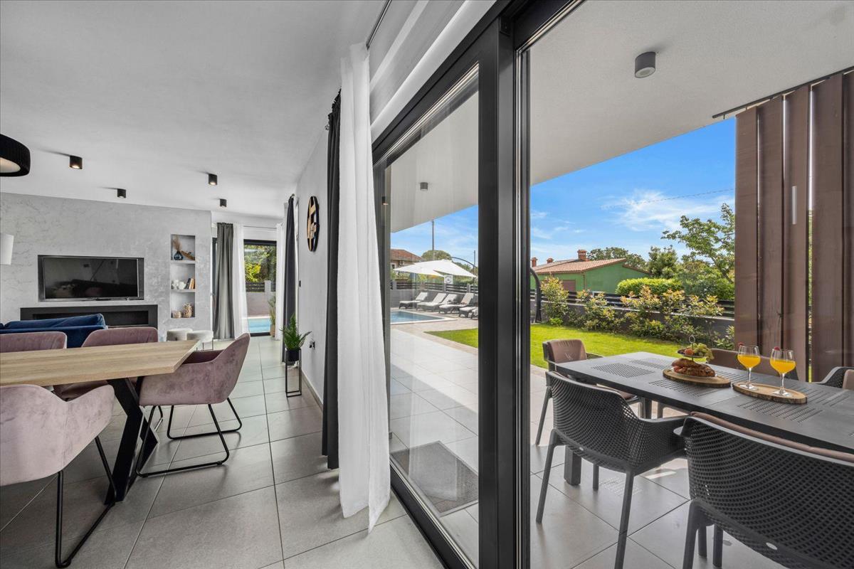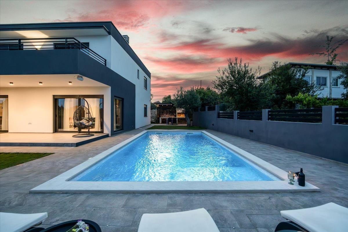 A villa leírása: Ez a villa panorámás kilátást nyújt a tengerre és Cres szigetére, összesen 238 m² lakóterülettel két emeleten. a földszinten található egy előszoba gardróbrésszel, amely egy nyitott terű nappaliba vezet, válaszfalak nélkül. Itt egy kényelmes nappali, egy modern és teljesen felszerelt konyha, valamint egy tágas étkező várja az egész családot. a villa természetes fényben úszik, köszönhetően az intelligens tájolásnak és a mozgatható üvegfalaknak, amelyek zökkenőmentesen összekapcsolják a belső teret a külső térrel.