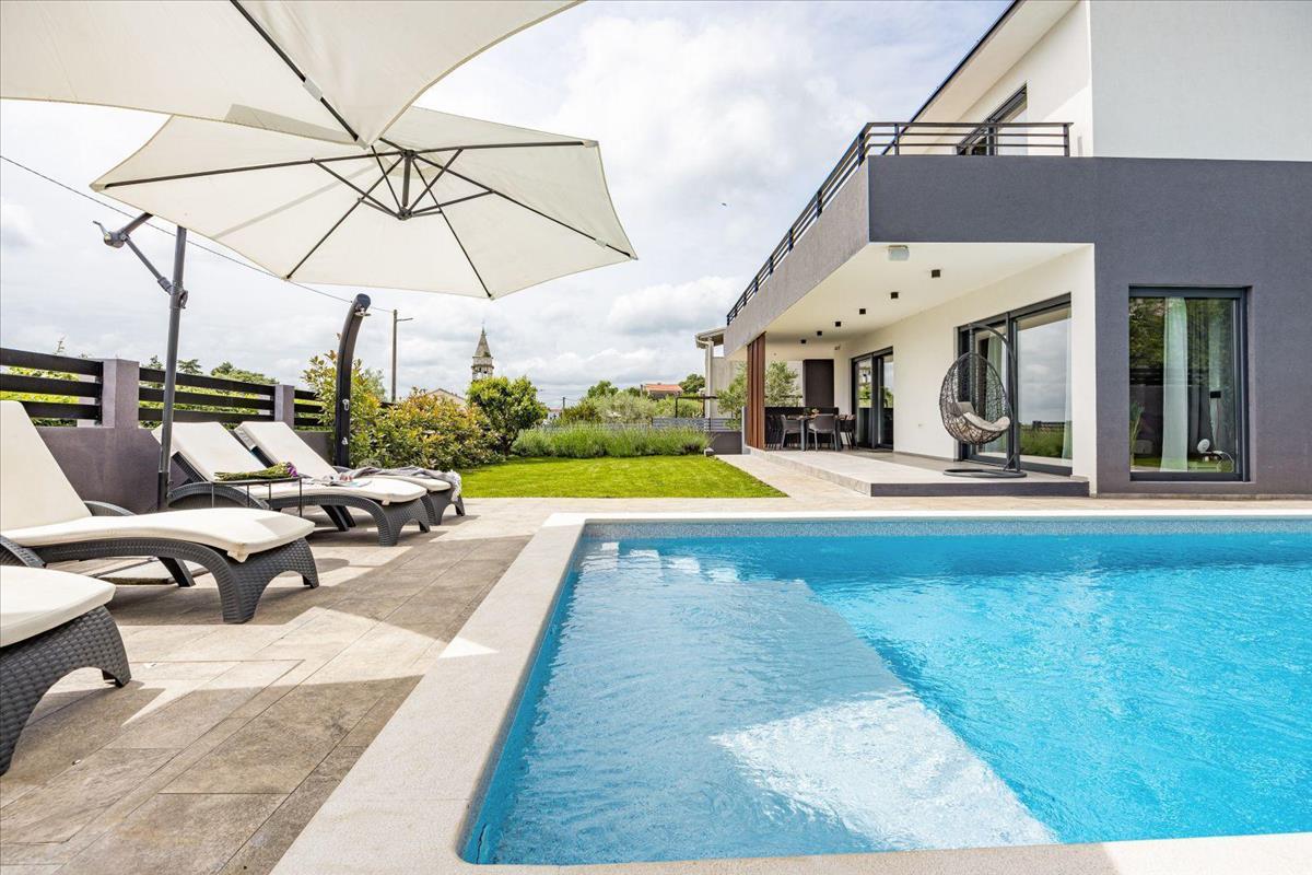Egy bájos családi településen, érintetlen strandok közelében áll egy gyönyörű, modern villa tengerre néző kilátással.