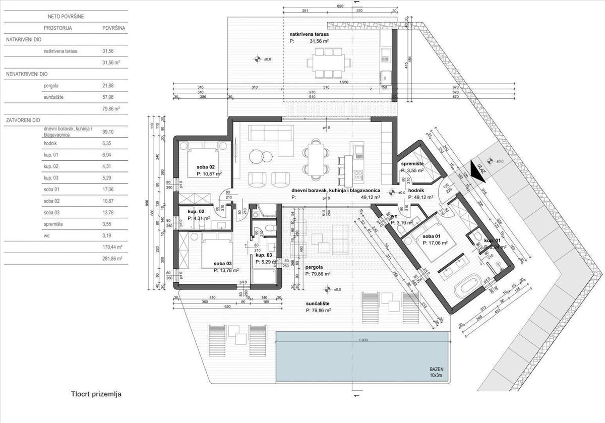 Tartalmaz egy nagy fedett teraszt (31, 5 m²) és egy úszómedencét (30 m²) napozóterasszal és pergolával. Déli fekvésű, csendes helyen, zöldövezet mellett található a ház, mindössze 1 km-re a tengertől.