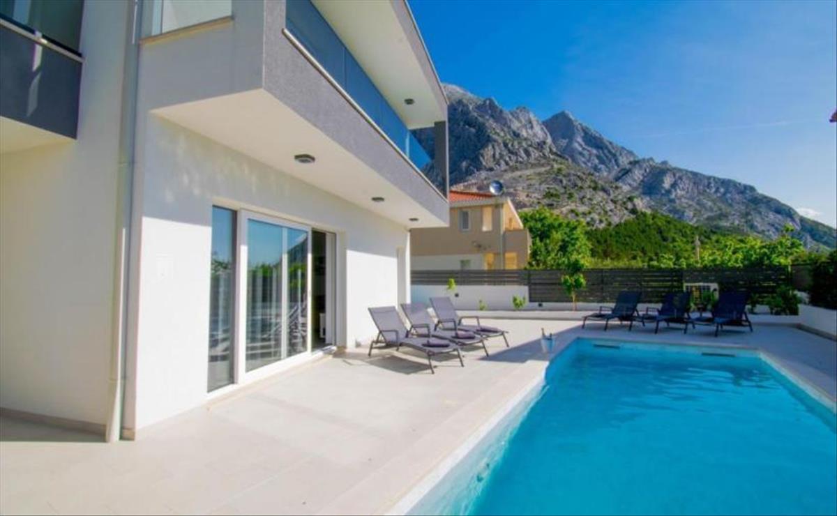 Elegáns új építésű, kubikus stílusú, modern villa úszómedencével Bast faluban, Baška Voda, kb. 2500-2900 Méterre a tengertől.