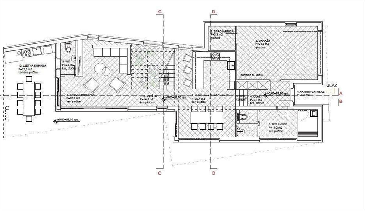 A földszinten található egy garázs, műszaki helyiségek, egy wellness pihenő, valamint egy elegáns, modern konyha, amely zökkenőmentesen kapcsolódik az étkezőhöz és a tágas lakótérhez. Kint a tervek szerint egy nyári konyha és egy káprázatos úszómedence lesz, amelyek a pihenés és a boldog szabadidő menedékévé válhatnak.