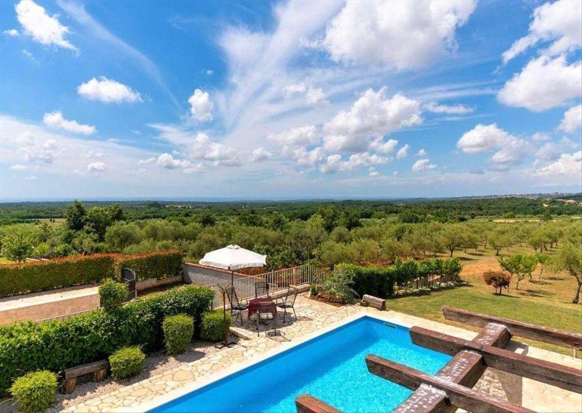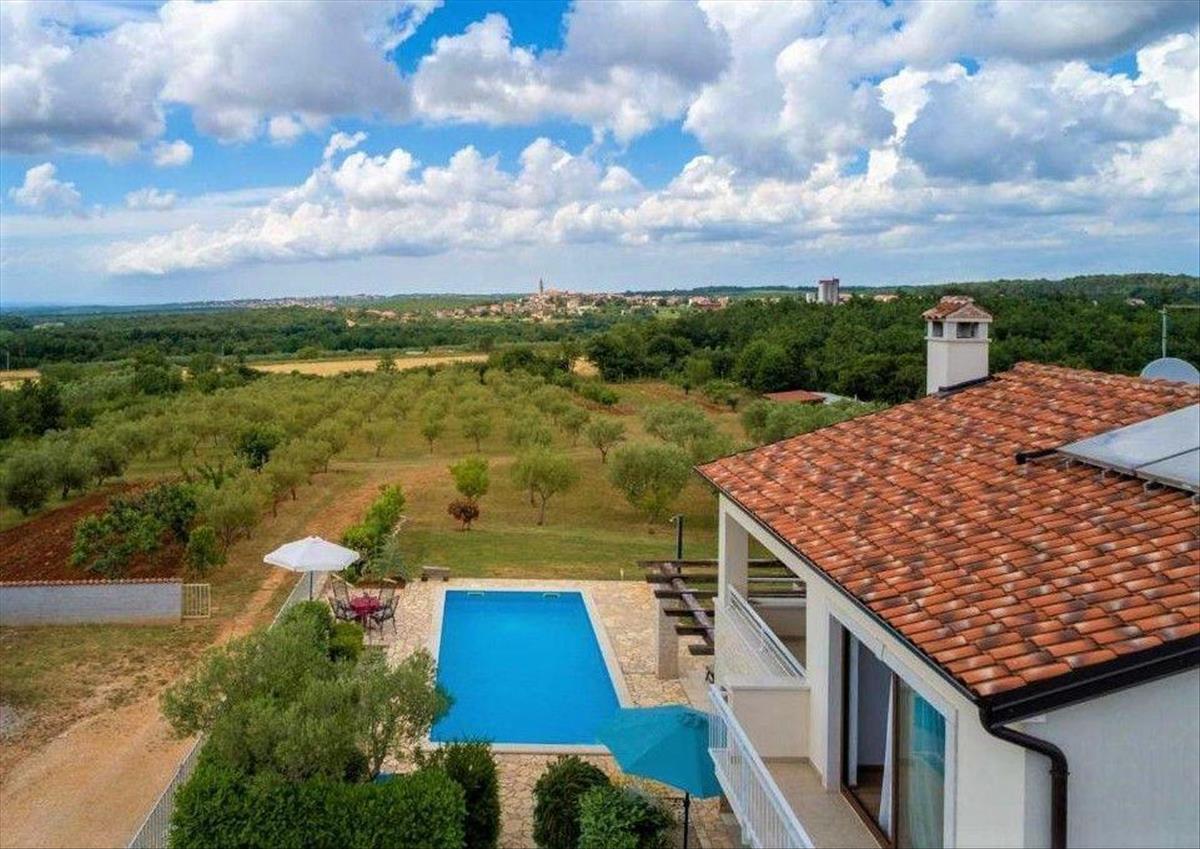 A villa mellett a kertben található egy 36 m²-es úszómedence napozóterasszal, ahonnan panorámás kilátás nyílik a zöldellő belső terekre és Višnjan festői városára, amelyet nem takarnak el az olajfaligetek és a környező mezőgazdasági területek. Villa az északnyugati oldalon.