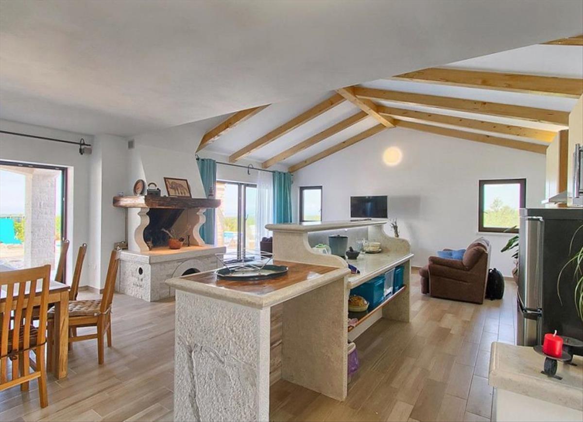 A villa belseje komfortot és légiességet áraszt, rengeteg természetes fénnyel és melegséggel, amelyet a magas mennyezet fagerendái idéznek elő.