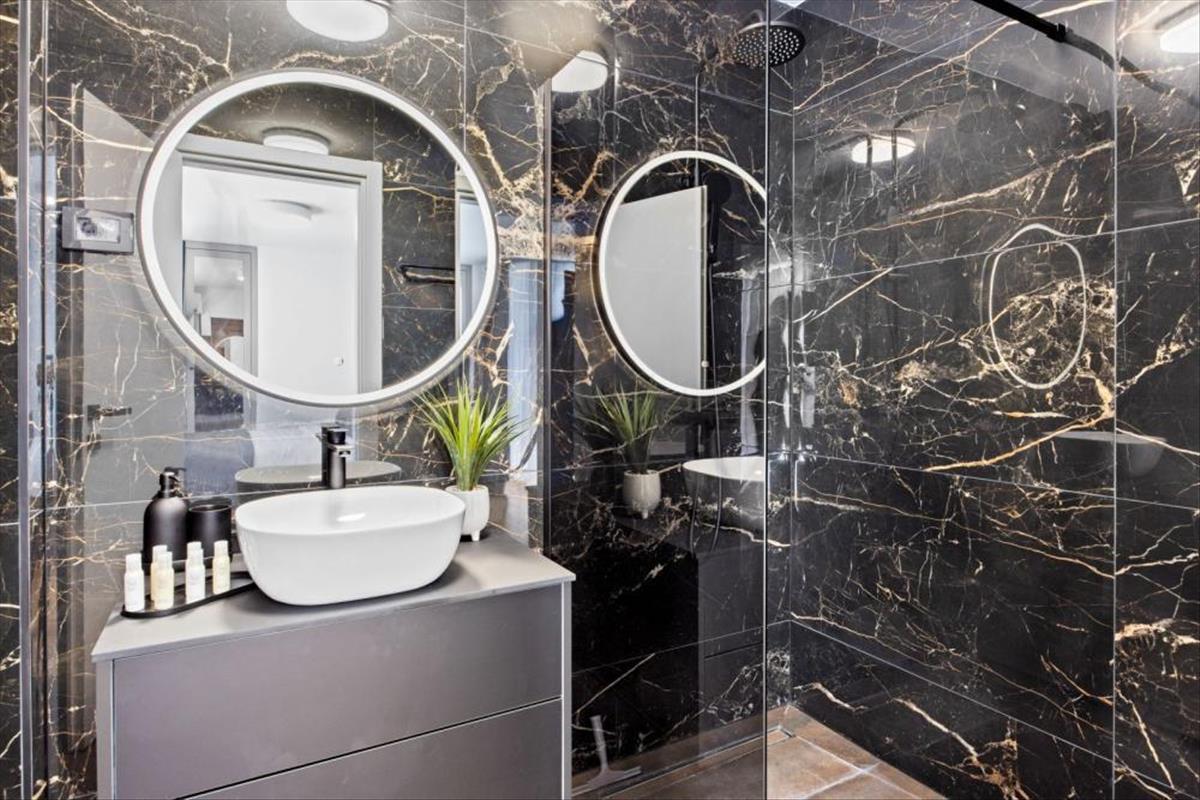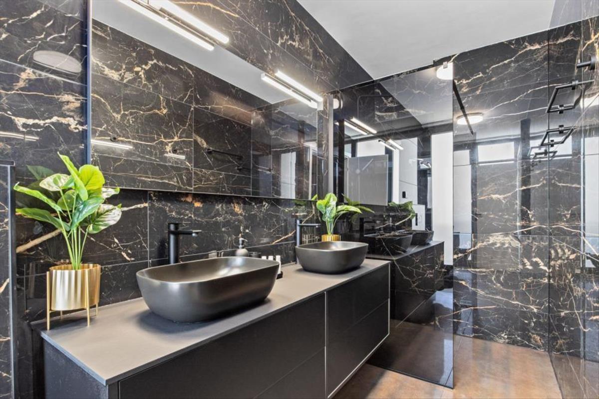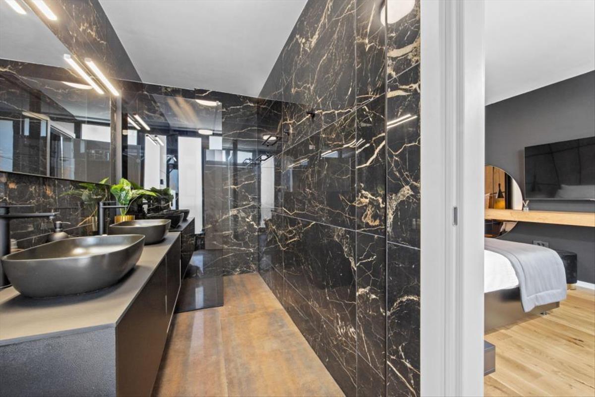 A földszinten tágas szalon, modern és személyre szabott Dieter Knoll konyha és étkező található. a nappali elektromos kandallóval és nagyméretű alumínium tolófallal gazdagodik, amely egész évben napfényt biztosít.