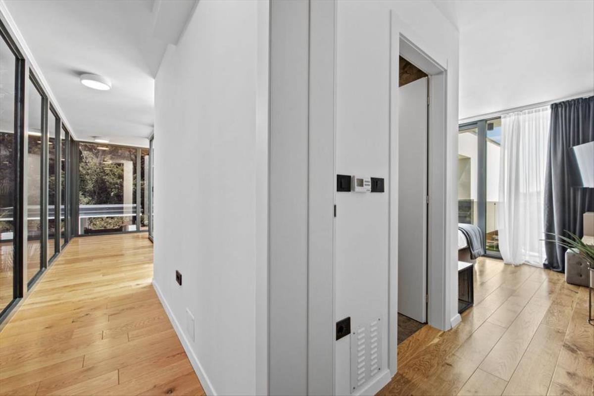 A belső lépcsőn felmászunk az első emeletre, ahol négy hálószoba található saját fürdőszobával, a folyosót pedig a ház teljes oldalán végigfutó üvegfal világítja meg.