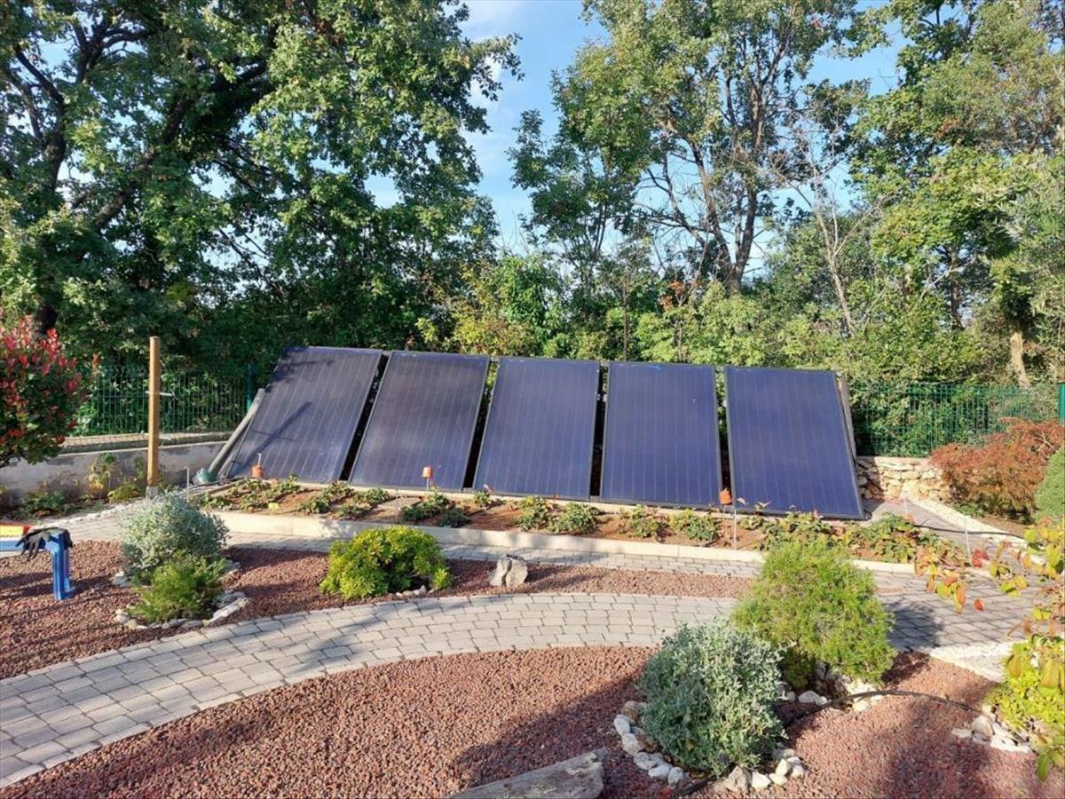 A fűtés és hűtés hőszivattyúval és 7, 5 KW-os napkollektorokkal megoldott.