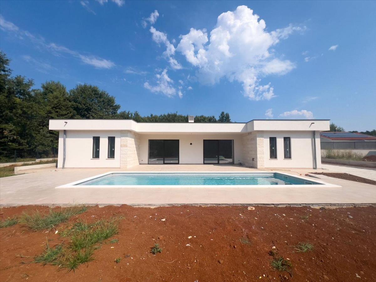 A modern villa medencével három hálószobából, három fürdőszobából, konyhából és nappaliból áll.