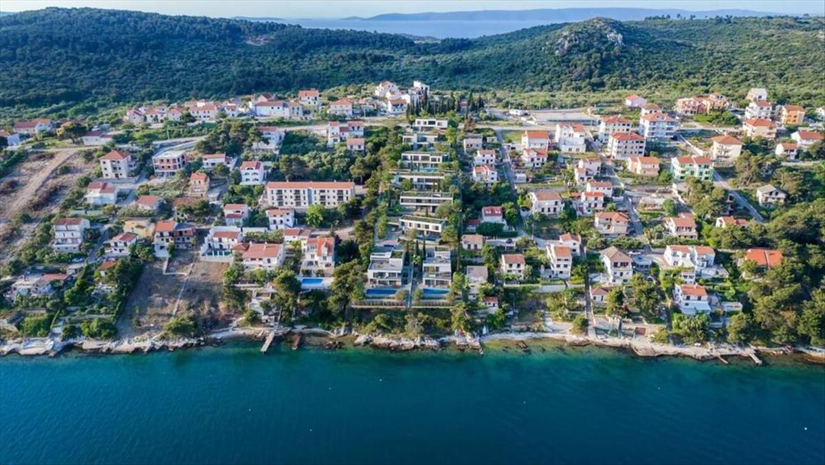 Ez az építészetileg egyedülálló, 3 szintes villa a második sorban található a tengertől egy új építésű modern társasházban Ciovo-n!
