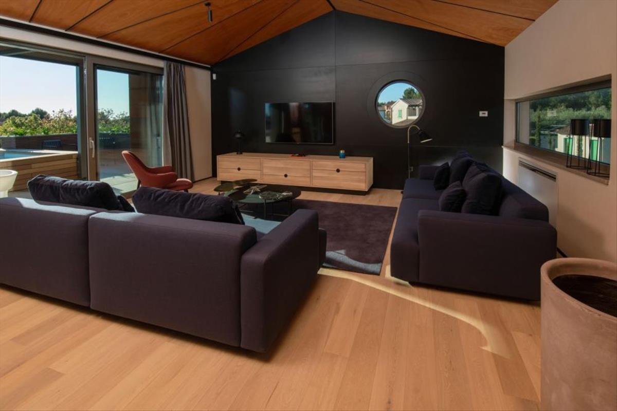 A 2020-ban épült villa a kortárs technológiák és az építészet nem hagyományos megközelítésének kifejezése. a villa teljes pompás területe három emeleten terül el, ugyanakkor kiváló minőségű helyi anyagokkal és dizájner bútorokkal van felszerelve. Így a villa földszintjén két tágas hálószoba található, melyek mindegyike saját fürdőszobával rendelkezik, és ahonnan közvetlen kapcsolat van az illatos kertben található napozórésszel. a földszinten egy nagyobb szauna is található, plusz zuhanyzóval. Tekintettel arra, hogy Isztria másik elnevezése a "Bor földje", a földszinten található villa egy modern borospincével tiszteli leendő tulajdonosait, ahol neves helyi borok találhatók. a földszinten található szobák mindegyike egy tágas, mediterrán díszítésű kertbe vezet, ahol a napozóterületen kívül egy olaj- és citromfák árnyékával védett étkezőrész is található.