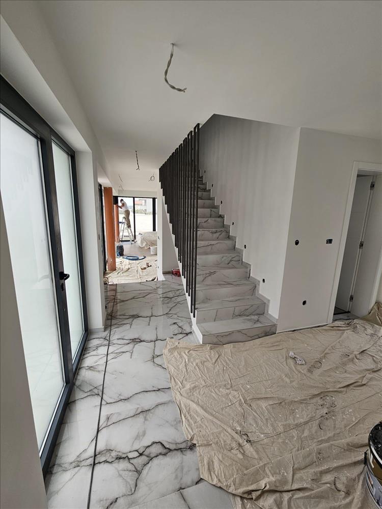 Belső lépcső vezet az emeletre, ahol egy előszoba, két hálószoba saját fürdőszobával, egy hálószoba fürdőszobával és gardróbbal, valamint egy részben fedett terasz található. Egy másik belső lépcső egy tágas tetőteraszra visz, ahonnan gyönyörű kilátás nyílik a tengerre.