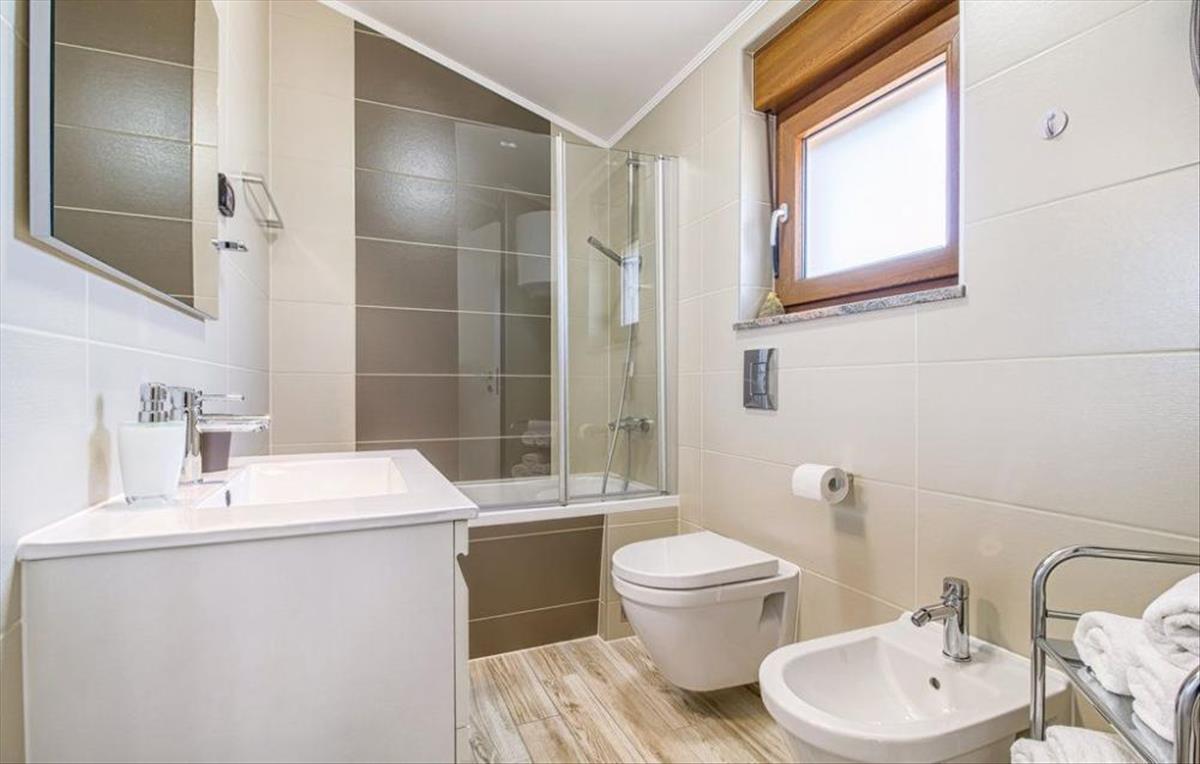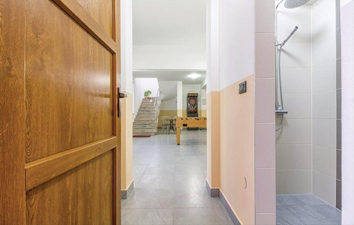 A földszinten található két hálószoba saját fürdőszobával, nappalival, konyhával és étkezővel, vendég wc, kamra és gépház, ahol egy 300 l-es bojler található a villa tetején található napkollektorokból nyert meleg vízhez. . a nappaliból és az egyik hálószobából kijárat a közös fedett teraszra és kertre ahol egy 25 m2-es mozaik medence található.