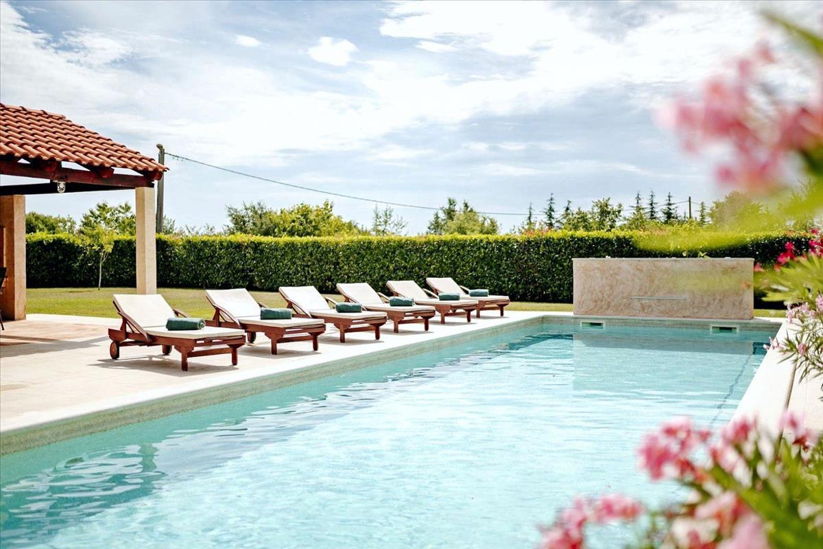 A kültéri terület teljesen kerített és mediterrán növényekkel és zöld növényzettel parkosított, privát és pihentető környezetet teremtve. a kertben található egy fedett nyári konyha, amely ideális kültéri étkezésre és szórakozásra, valamint egy medence napozóterülettel, amely jelentősen növeli az ingatlan értékét és vonzerejét az istriai turisztikai bérbeadási piacon.