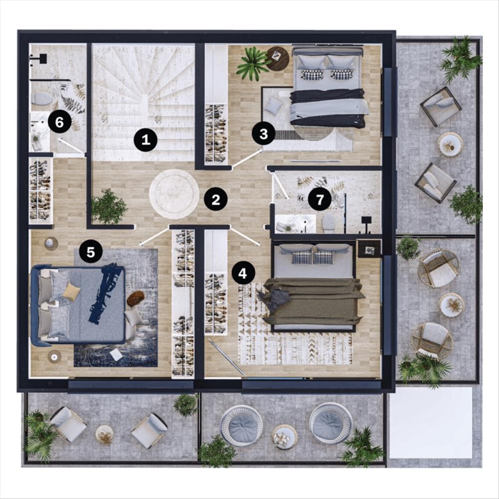 Az első emeleten 3 további varázslatos hálószoba vár rád, mindegyik saját luxus fürdőszobával, biztosítva az intimitást és kényelmet az egész család számára. Minden szoba gondosan megtervezett, hogy maximális kényelmet nyújtson, és csendes sarkot kínáljon a pihenéshez és relaxációhoz. De ez még nem minden!