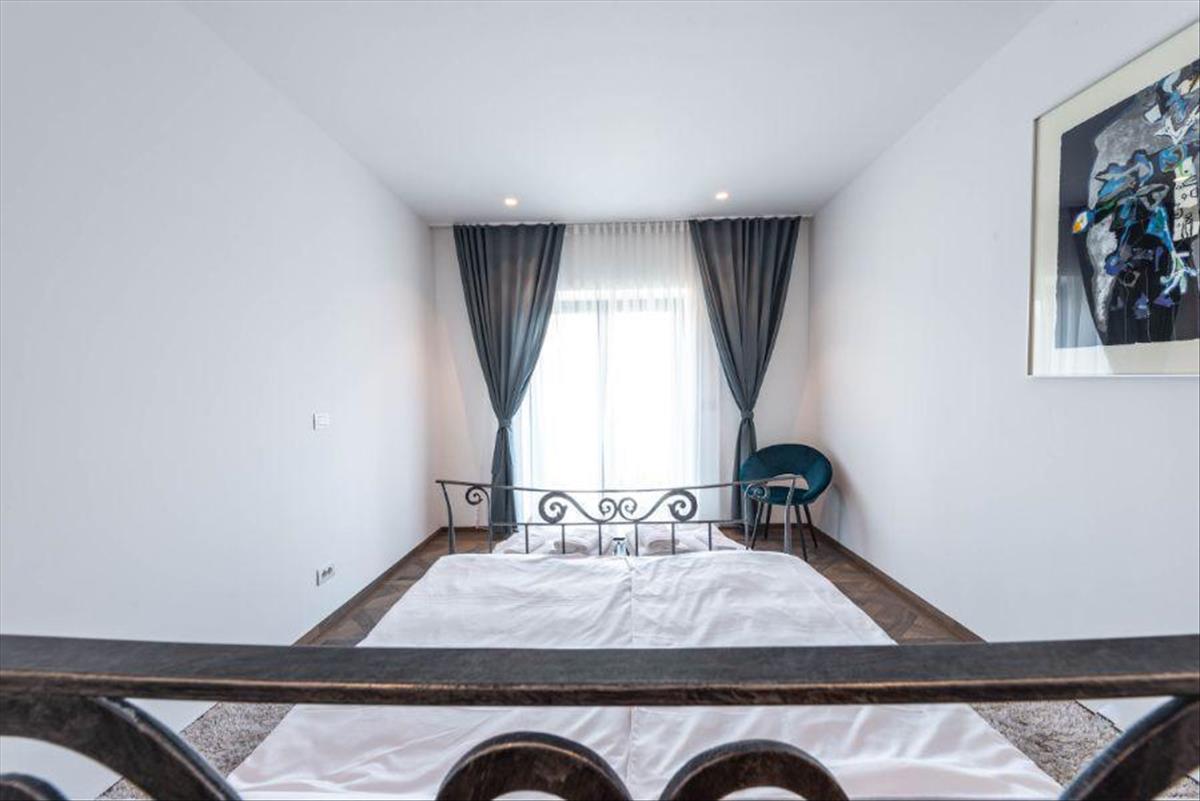 Alsó szint: négy hálószoba gardróbbal, négy fürdőszoba, előszoba, mosókonyha, borospince, tároló helyiségek.