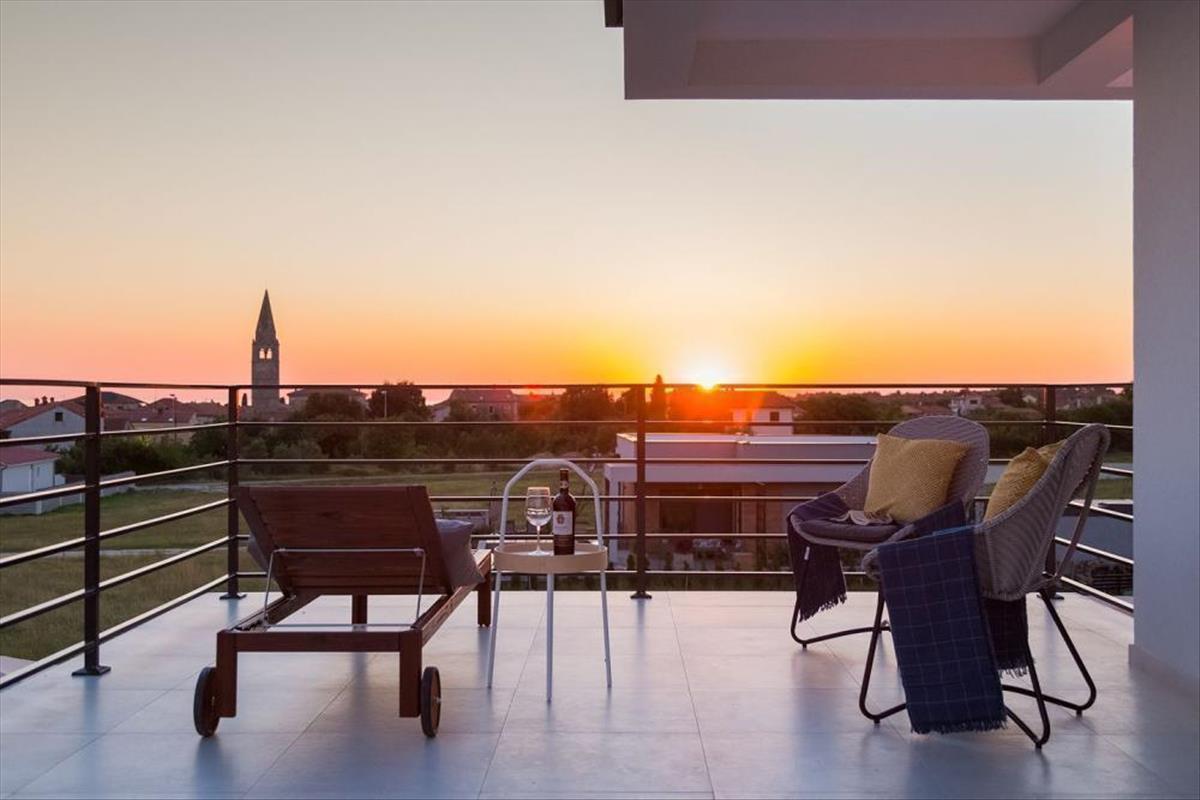A villa első emeletére egy belső modern lépcsőn lehet feljutni, ahol három kényelmes hálószoba található. Minden hálószobából terasz nyílik, a két kisebb hálószoba ugyanazon a teraszon osztozik, míg a nagyobbik hálószobából saját terasz nyílik. Minden teraszról gyönyörű kilátás nyílik a falura, a tengerre és a zöld mezőkre. Ezenkívül a nagyobbik hálószobához saját fürdőszoba tartozik, míg a másik két kisebb hálószobához közös fürdőszoba tartozik.