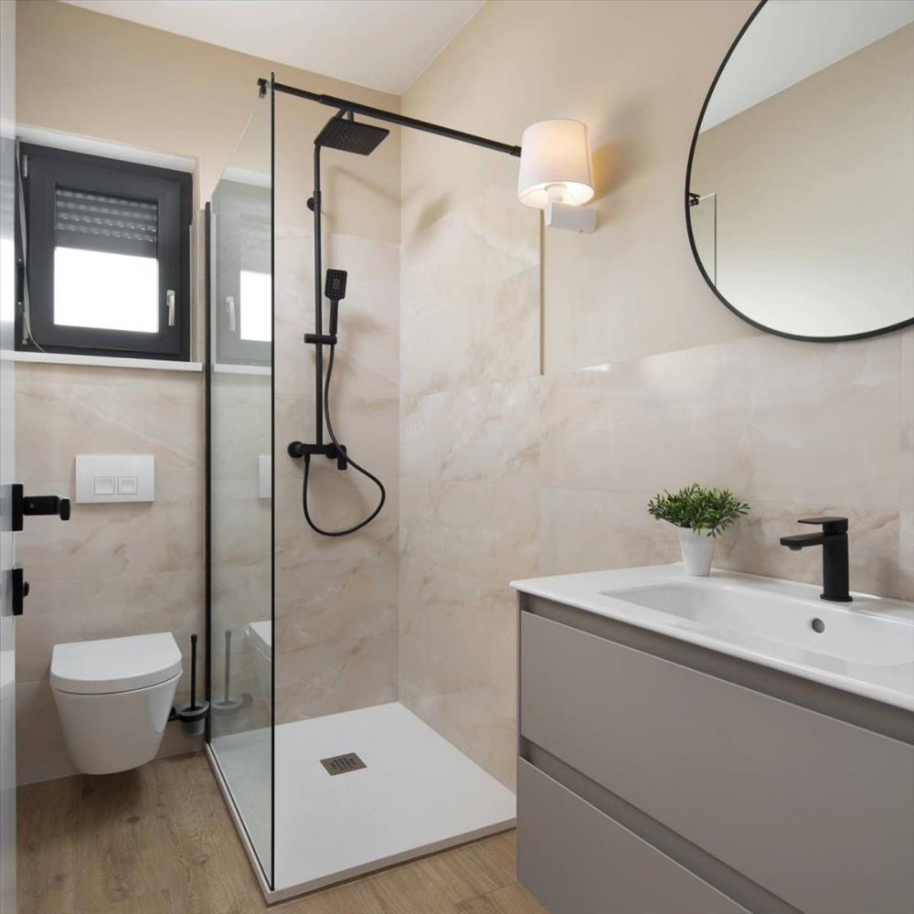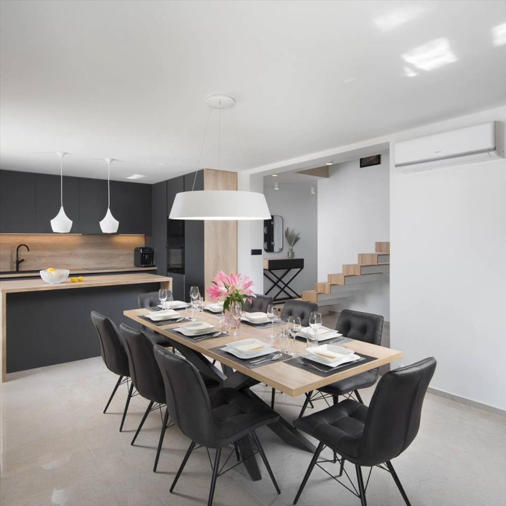 A kifinomultságra és kényelemre tervezett 232 m²-es villa modern belső terével a funkcionalitásra és a stílusra összpontosít. a tágas nappali, egy kényelmes kandallóval, zökkenőmentesen átfolyik egy elegáns étkezőbe és egy teljesen felszerelt konyhába. Ezek a terek egy fedett teraszra és egy nyári konyhára nyílnak, kandallóval, így meghívó kültéri teret teremtve a pihenéshez és a szórakozáshoz.