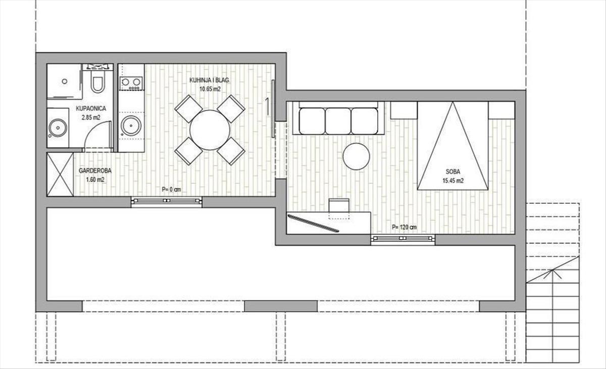 Alsó szint: szalon, konyha, vendégszoba és fürdőszoba.