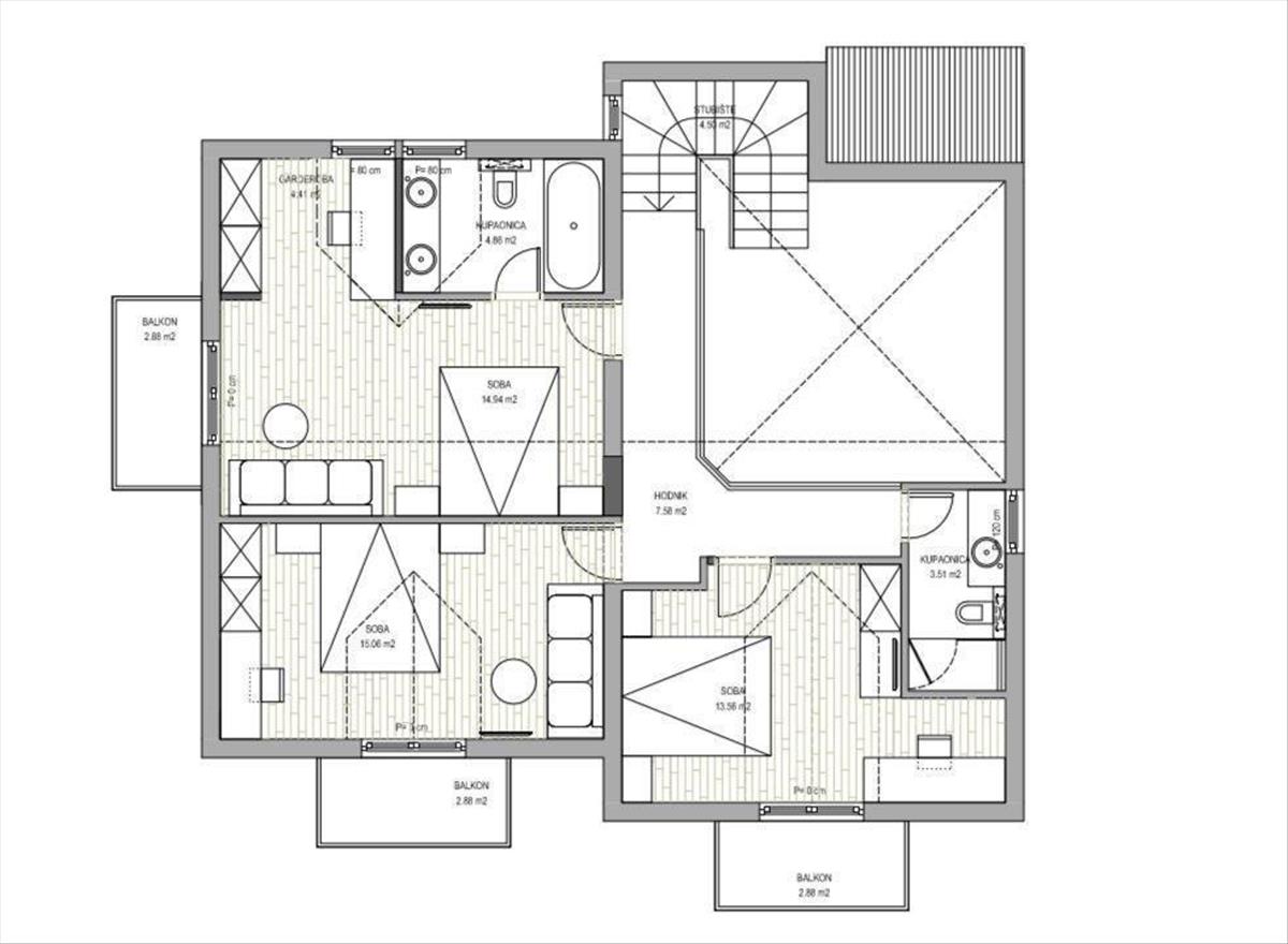 Felső szint: előszoba, két hálószoba, fürdőszoba, fő hálószoba fürdőszobával és öltözővel, valamint több erkély.