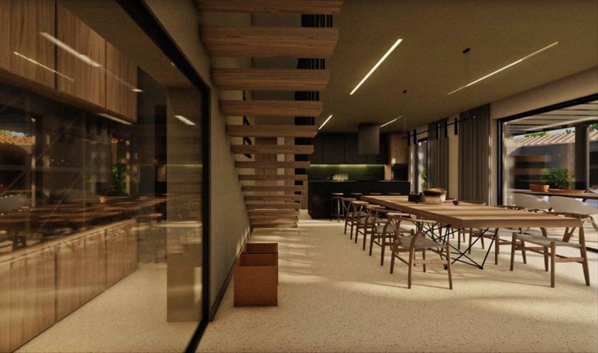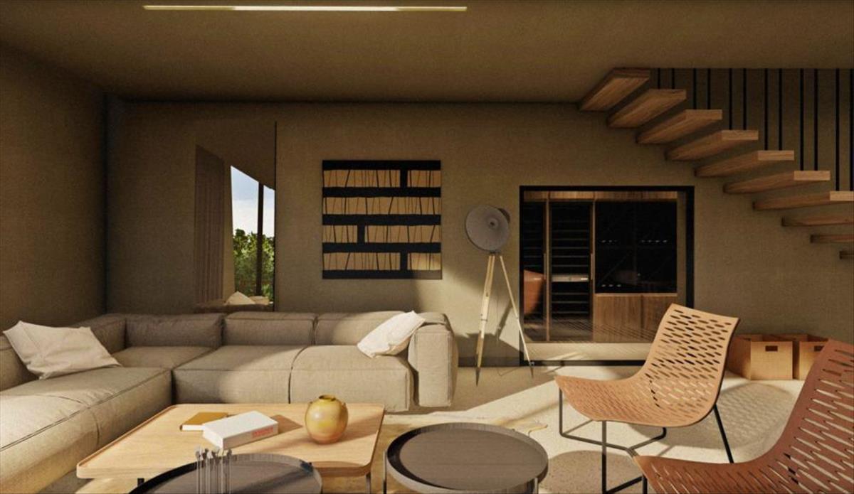 A földszinten egy nyitott elrendezésű nappali található, amely egyesíti a nappalit, az étkezőt és a konyhát, ahonnan ki lehet jutni a fedett tornácra, borozóra és vendég WC-re. a földszint alaprajzát garázs és műszaki helyiség egészíti ki.