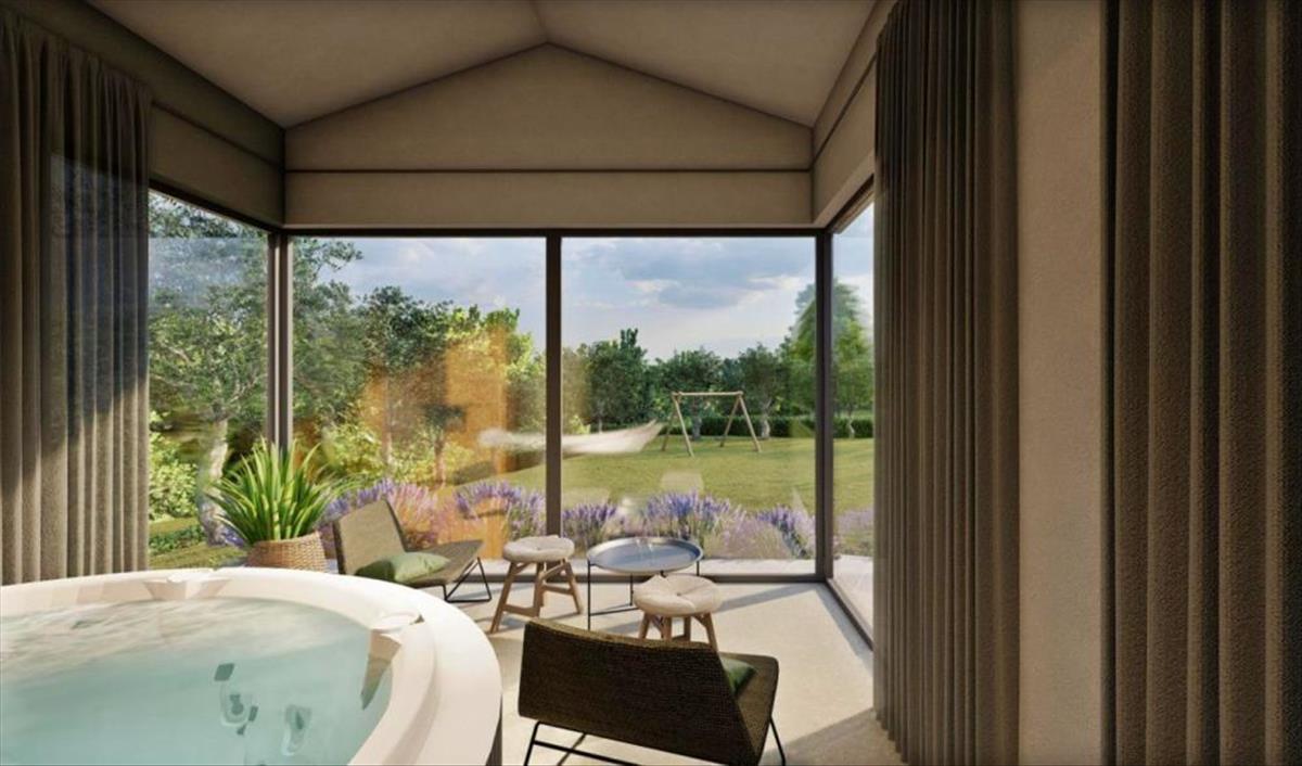 Ennek az elegáns ingatlannak minden részlete gondosan megtervezett, és az eredmény egy első osztályú ingatlan, amely menedéket jelent az igazi hedonisták számára. a villa formája és színvilága illeszkedik a faluhoz és a tájhoz, és a hagyományos építészetet kortárs módon értelmezi újra a helyi természetes anyagok (kő és fa) felhasználásával, miközben a lenyűgöző üvegfalak sok természetes fényt engednek be, ami finom határvonalat jelent. Belső és külső között.