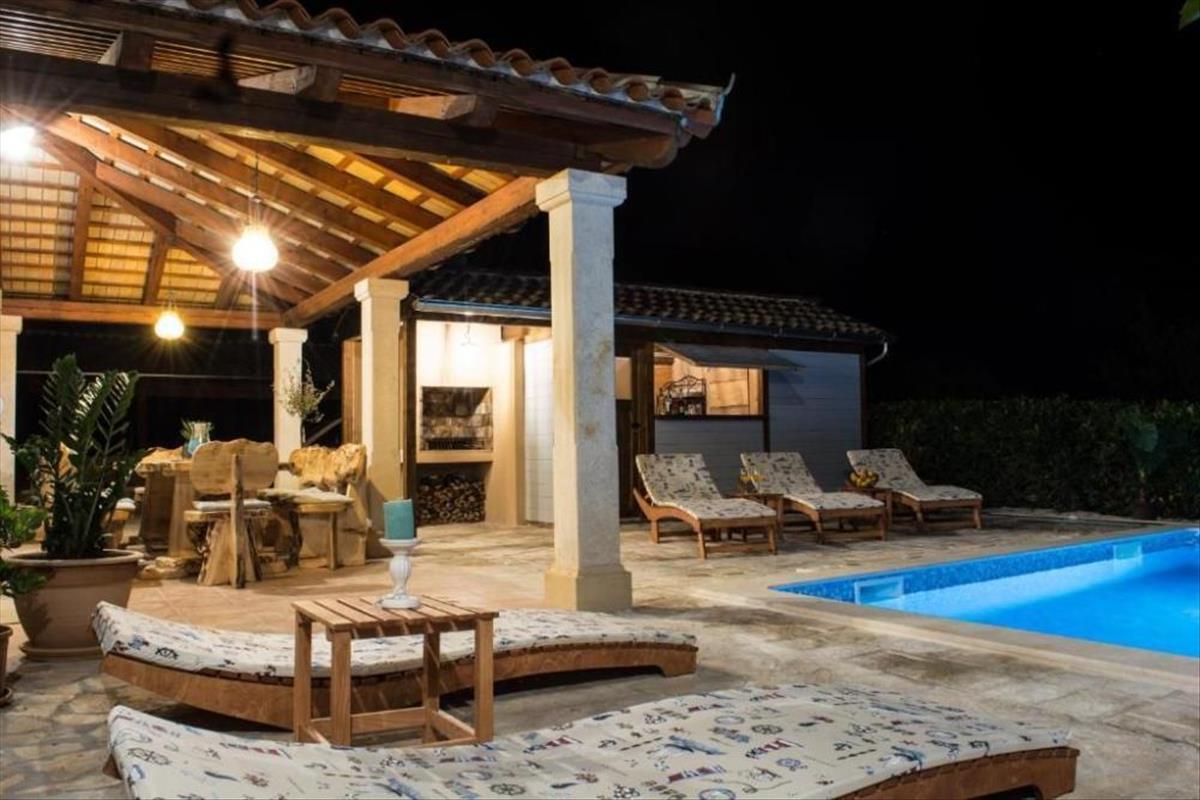A kert központi részét így az úszómedence és egy nagyobb napozórész foglalja el, az uszoda mellett a szőlő természetes árnyékában megbúvó, kő grillezővel ellátott nyári konyha található.